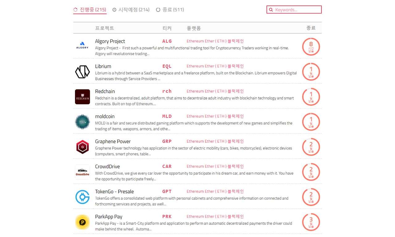 'ICO' 메뉴에서는 ICO에 참여할 수 있는 블록체인 기반 암호화폐를 확인할 수 있다. 특정 ICO 기간이 얼마나 남았는지, 목표량과 총 공급량은 얼마이고, 팀 구성 등의 정보를 확인할 수 있다.