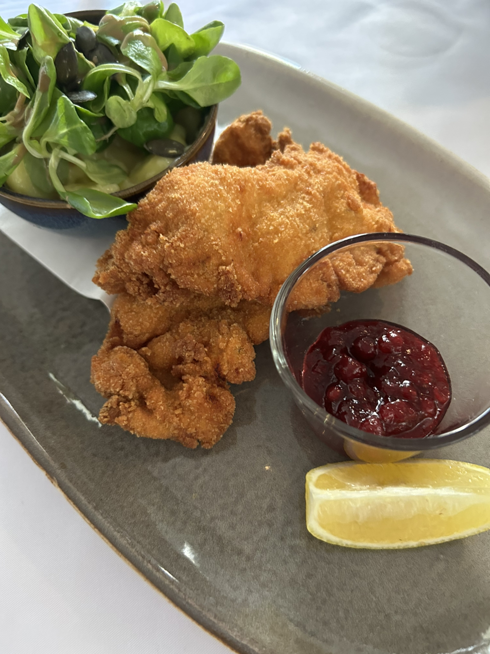 다른 곳에서 먹었던 슈니첼보다 바삭한 식감의 슈니첼로 상큼한 잼을 곁들여 먹었다.