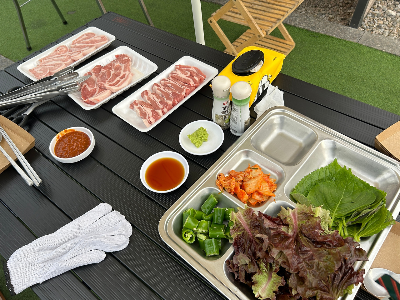 쌈채소, 쌈장, 간장 소스, 와사비, 종이그릇, 집게, 숟가락, 젓가락은 재료를 구매할 때 함께 챙겨 오면 된다. 텐트 안쪽에서 테이블을 꺼내와 야외 공간에 바베큐를 즐길 공간을 마련했다.
