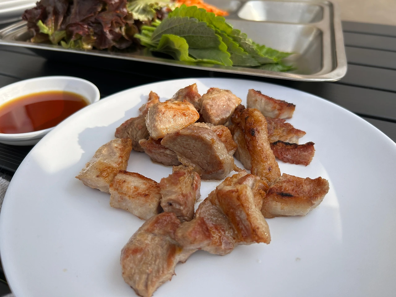 숯불이 준비되면 불판을 깐 뒤 고기를 구워 먹을 수 있다. 목살, 항정살, 가브리살을 선택했는데 고기 질이 괜찮았다. 숯불향이 더해져 더욱 맛있었다.
