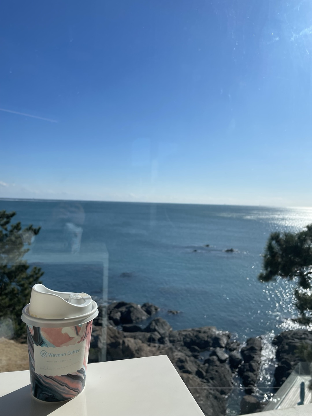 아마 이때는 부산 와서 처음으로 맞이하는 바다라서 더 사진 속에 담고 싶은 마음이 들었던 것 같다. 여유롭고 아주 좋았다. 정말 핫팩이 없었다면 큰일 났을 수도 있었을 거다. 사진을 다 찍고 커피숍까지 5분 정도 걸어왔다. 10시 오픈인데 11시쯤 도착해서 사람이 많이 없었다. 아주 좋은 산택. 가자마자 메뉴판은 보지도 않고 아메리카노를 시켰다.
