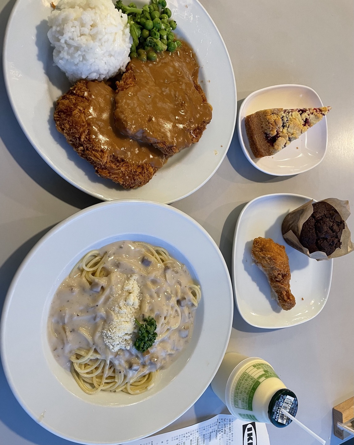 나의 저녁밥. 점심을 걸렀기 때문에 진짜 먹고 싶은 걸 다 담았다. 그래서 이 한 끼에 3만 원 정도 썼다. 이케아. 예상외의 맛집이었다. 돈가스는 바삭하진 않았지만 (애초에 미리 만들어놓는 거라 바삭함은 기대도 하지 않았다.) 패티의 고기는 아주 맛있었다. 고기가 매우 촉촉하고 일반적인 돈가스 소스가 아니라서 더 신선한 경험이었다. 크림스파게티는 그냥 평범했고 진짜 메인은 크림치즈 조각케이크였다. 진짜 메뉴판에서부터 엄청 추천하는 음식이었는데 진짜 돈값을 하는 음식이었다.... 만약 이케아에 가서 밥을 드실 분들에겐 디저트로 꼭 이 메뉴 강추한다. 양이 많긴 했지만, 난 대식가이고 점심까지 거른 상태여서 무리 없이 깔끔하게 다 먹었다. 그리고 이케아 구경이라고 해야 되나... 그냥 나가려고 사람들을 따라 내려갔다. 화살표를 따라가면 나 가는 길이 나온다길래 그대로 따라갔는데 생각보다 더 구불거리는 길이었다. 친절하게도 바닥에 화살표를 만들어주신 관계자분들께 심심한 감사의 말씀을 드리고 싶다. 그렇게 이케아에서 나왔다. 신기하게도 배가 불러서 그런지 별로 춥지가 않았다. 오시리아 역으로 걸어가며 주변을 둘러보았다. 확실히 동부산쪽은 아직 많이 발달이 된 느낌은 아니었다. 밤거리는 좀 쓸쓸한 느낌? 밤하늘로 비상하는 비행기가 그런 느낌을 더해주었다.