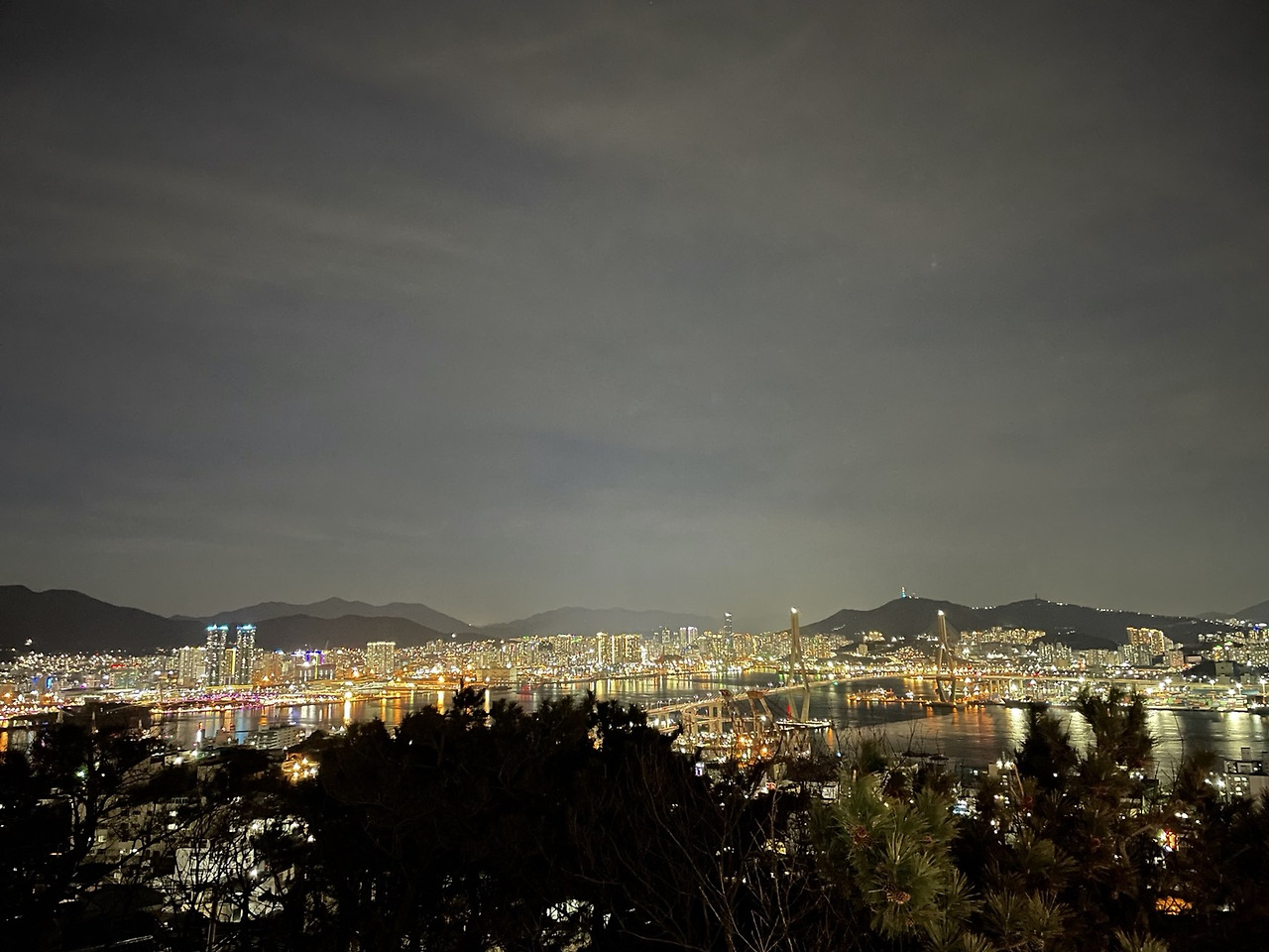 어느 정도 잘 나온 야경 같지만.. 이 야경은 사실 많은 아쉬움과 한이 서려있는 풍경이다. 청학배수지 전망대에서 추위에 오들오들 떨어가며 거의 한 시간 가까이를 기다렸다. 그 이유는 부산항대교가 점등하는 걸 보기 위해서였다. 하지만 7시가 다 되어 가도록 불이 절대 켜지지 않았다. 정확한 시간이 정해져 있는 건 아니었지만 11월에 6시 45분에 켜졌다고 해서 참을성 있게 칼바람 맞으며 기다렸는데..... 안 켜졌다. 그래서 그냥 그런대로 최대한 열심히 찍었다. 내가 1시간 기다릴 동안 약 5쌍의 커플이 왔다 갔다. 청학 배수지 전망대 문지기를 자처한 수준이었다.