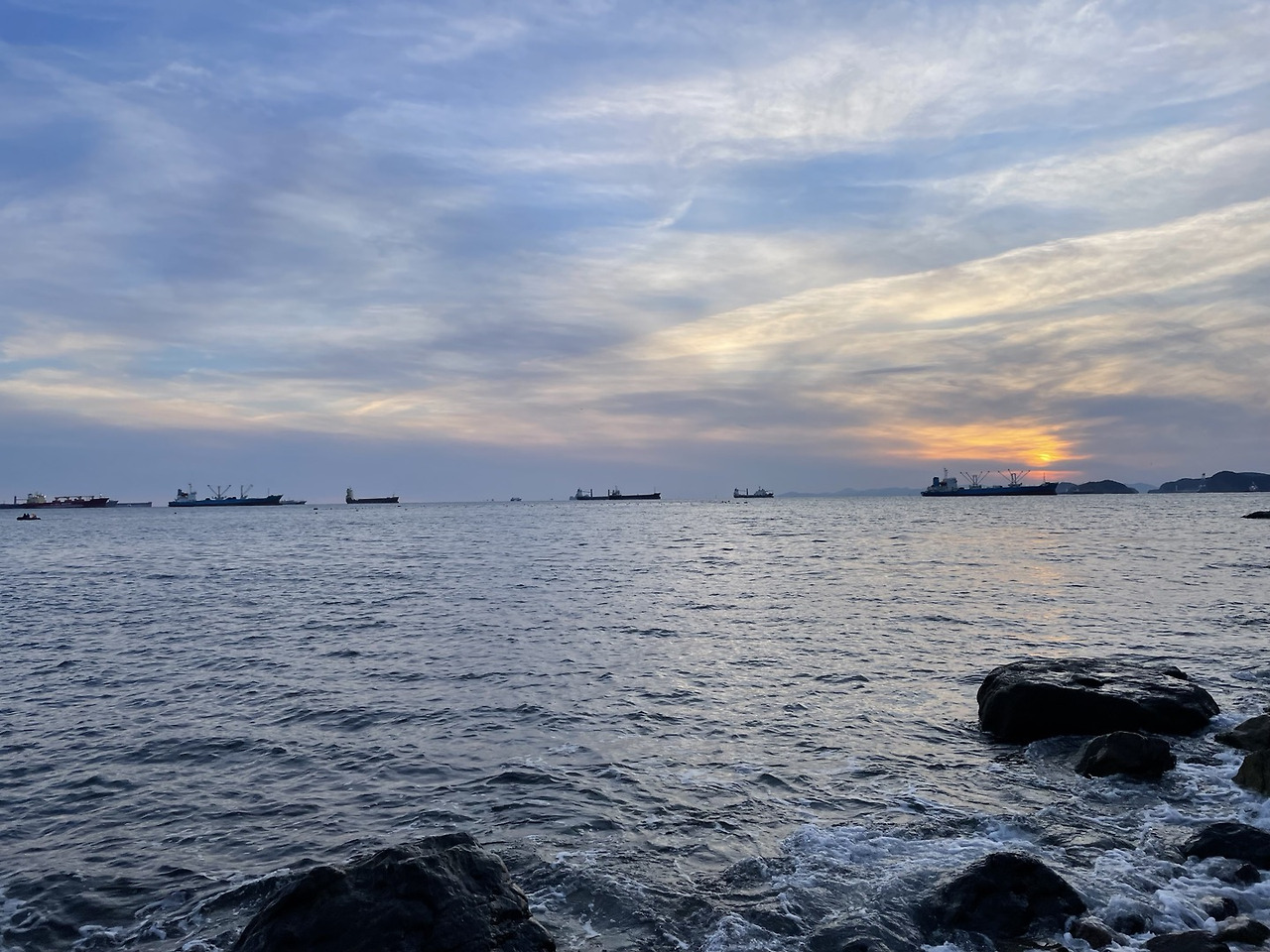 이때쯤 이미 2만보를 넘긴 상태였는데 중리노을전망대까지 2킬로 거리였다. 버스를 타고 가기엔 애매하다고 생각해서 그냥 쭉 걸었다. 생각보다 길었지만 노래와 함께 가서 그리 길진 않았다. 가는 길이 차도밖에 없어서 길가로 조심조심 갔는데 아마 차들이 날 신기하게 생각했을 것 같다. 중리노을전망대는 막상 갔더니 별로 볼 게 없었다. 그래서 근처 바다에서 파도와 지는 해를 담을 타임랩스를 찍으며 20분 정도 멍 때리고 제시간에 맞게 마지막 코스인 청학배수지 전망대를 찾아갔다.