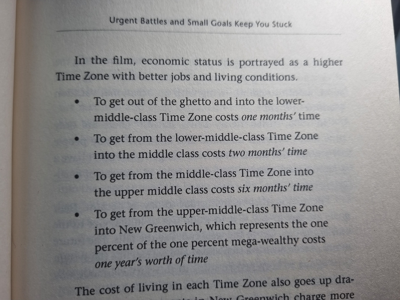 2011년 개봉한 SF영화 인타임에서는 경제적 지위가 타임 존으로 묘사되는데, 상위 타임존에 사는 사람들은 더 나은 직업과 생활 여건을 갖추고 있다. 놀라운 건, 타임 존 사이의 이동 시간. 게토 지역에서 하위 타임존으로 가는데는 한 달이면 되지만, 상위 타임존에서 최상위 그룹으로 가는데 드는 시간은 1년의 가치를 지닌다. 시간 사용법이 다르다. 아니, 시간의 가치가 다르다.