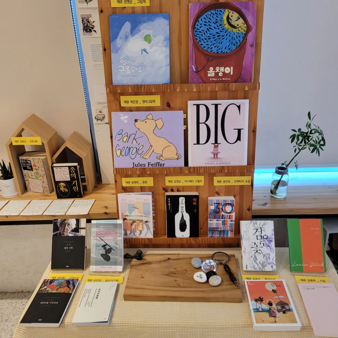 책방은 책꾸러미, 강연, 북토크, 학교 단체 방문 등 이미 1인이 해내기에 버거운 일들로 가득해서 초반에 시작이 지지 부진했다. 진심 공동체 중에서도 유난히 진심인 내가 바쁜 대표님에게 '우리 전시는 어떻게 진행되는 걸까요?'하고 묻게 된 것이 기폭제가 되어 6월 책Q 전시는 무탈히 진행되고 있다.