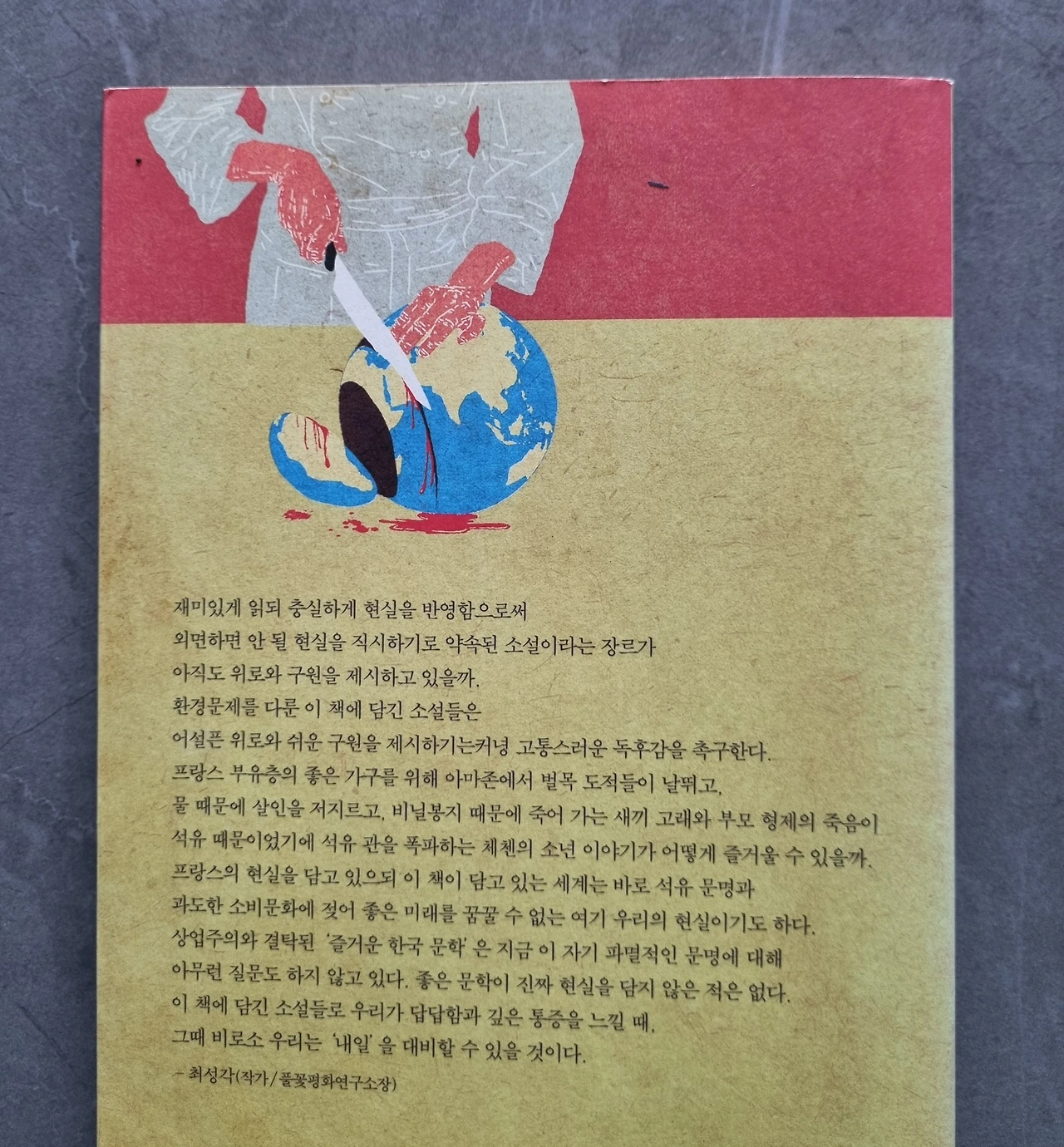 하나도 괜찮아 보이지 않는 소년은 미래에서 왔으리라 추측했다. 단면이 잘려나간 고깃덩어리 같은 지구를 들고 있는 방독면 소년의 눈빛은 확인할 수 없지만 필시 원망이 깃들어 있을 것이고.