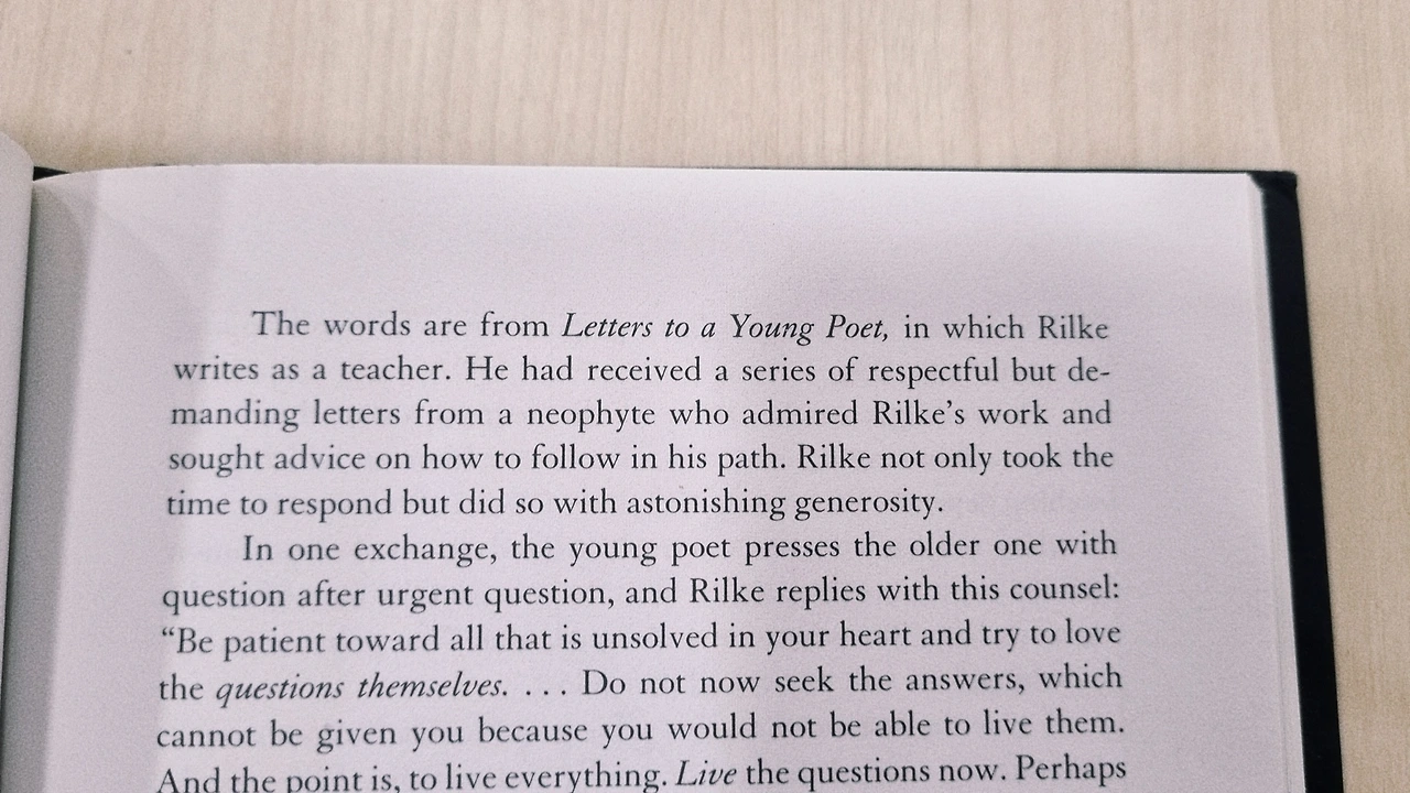 미국의 존경받는 교육 지도자이자 사회 운동가인 파커 J. 파머는 교육 에세이집 가르칠 수 있는 용기에서 시인 릴케가 시인 지망생 프란츠 카푸스에게 보낸 편지의 일부를 언급한다.