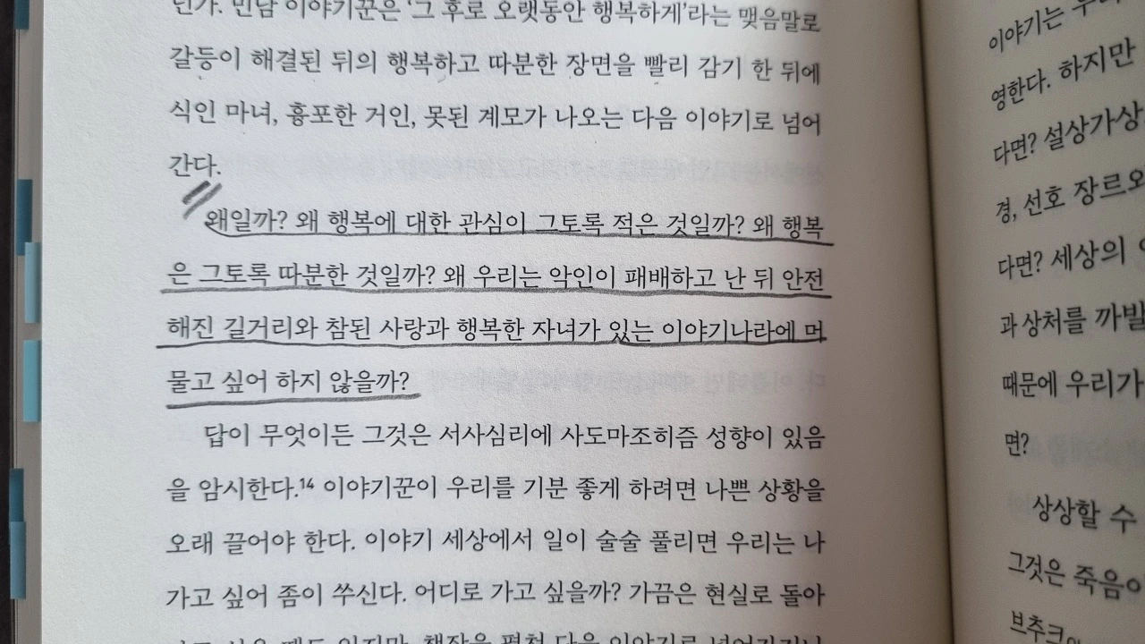 우리는 행복한 이야기를 듣고 싶은 게 아니라, 행복해진 이야기를 듣고 싶어하는지도 모른다. 세상은 사람이 아니라 문제로 이루어져 있으므로 내가 문제를 가진 게 아니라, 문제가 나를 가졌다. 세상엔 이야기도 산다. 사람이 살아온 시간만큼 이야기가 살았다. 사람이 죽어도 이야기는 남을테니. 사람보다 오래 산다.