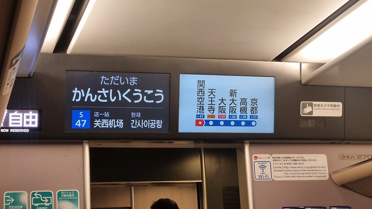 고등학교 때 이후로 끊었던 일본어. 가타카나, 히라가나를 열심히 외워갔지만 정작 간사이 공항에서 교토시로 가는 하루카 열차를 타기 위해 필요한 건 거의 놓칠 뻔한 캐리어를 낚아채는 짝꿍의 순발력과 키티 로고를 알아보는 우리의 시력. 열차 칸 사이에 캐리어를 싣고 자리에 앉아서야 눈에 들어오는 다국어의 향연. 아~ 의미 없다.