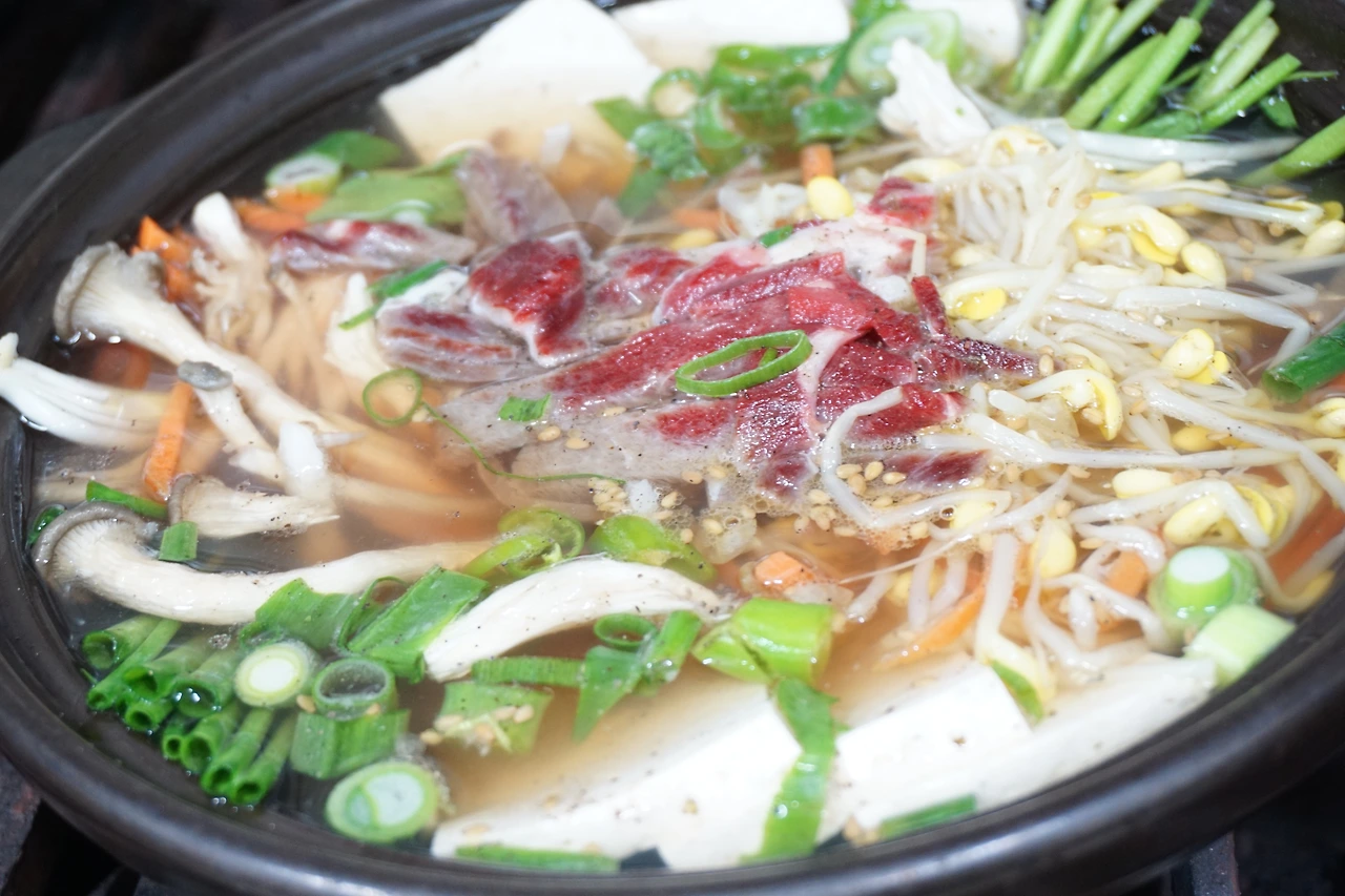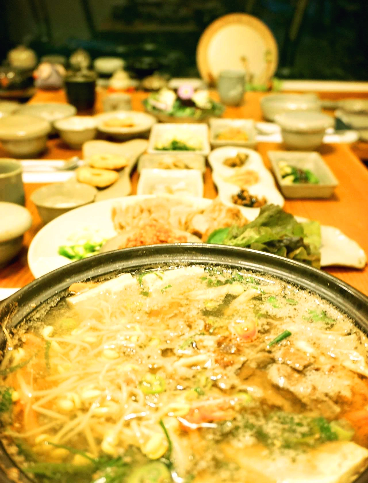 그녀의 부엌을 들어가 보았다. 손수 말리고 갈아 만든 조미료는 통마다 이름표를 붙여 가지런히 정리해 놓았다. 아침에 따온 채소와 식용 꽃들도 다소곳하게 손질되어있다. 전골냄비에는 두부와 한우, 콩나물, 버섯 등이 끓고 그 옆에는 비지로 만든 콩전이 기름 위에서 지글지글 소리를 낸다. 그리고 두부삼합.