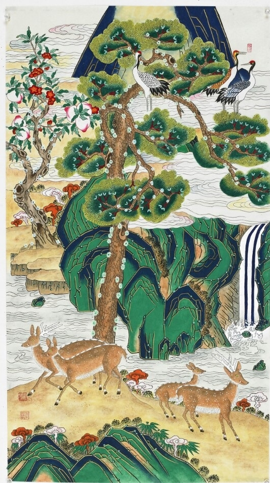 소나무는 불로장생, 영원을 상징하는 나무이다. 그래서 우리 민화의 십장생도(十長生圖)에 등장한다. 주된 내용은 불로초와 사슴·학·대나무·구름·해 등이며 커다란 암석에 웅장하고 아름다운 소나무를 배치한다. 소나무는 임금의 용상 뒤를 장식하는 일월오봉도(日月五峯圖)에도 그려진다. 일월오봉도는 왕권을 상징할 뿐만 아니라 백성들의 태평성대를 염원하는 의도에서 제작되는데 다섯 개의 산봉우리와 해, 달, 소나무, 물이 일정한 구도로 배치된다.