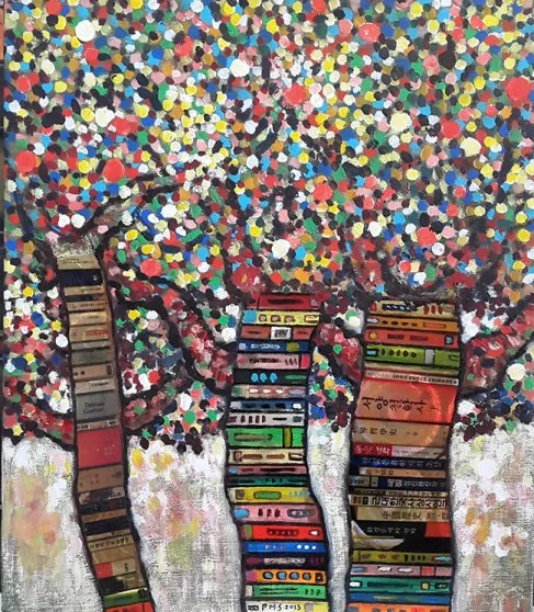 반면, 나무 그대로의 모습으로 그 이미지를 그리는 작가도 있다. 박명선 작가(런던 예술대학 순수미술, 석사)의 나무 그림은 마치 인문학 서적과 철학서적을 품고 성장하고 있는 사유(思惟)하는 나무의 모습이다. 그림 속의 홀로그램은 ‘근원의 빛’을 상징한다. 사색적인 나무는 생각의 깊이만큼 다양한 빛을 담고 있으며 또 다른 인간의 모습과 닮아 있다.