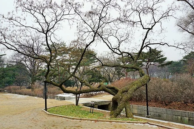 춘당지에서 흐르는 물길을 따라 걷다 보면 선인문(宣仁門)을 바라보는 몹시 굽은 나무 한 그루를 만나게 된다. 이 역시 회화나무이다. 선인문의 굽은 회화나무도 동궐도에 그려질 만큼 오래된 나무이다. 2015년 상영되었던 영화 ‘사도(思悼, The Throne)’에서 연출한 것과는 달리 사도세자는 명정전(明政殿)과 문정전(文政殿)에서 떨어진 선인문 앞에서 죽음을 맞았다고 한다. 나무 아래의 안내판에는 다음과 같이 설명하고 있다.