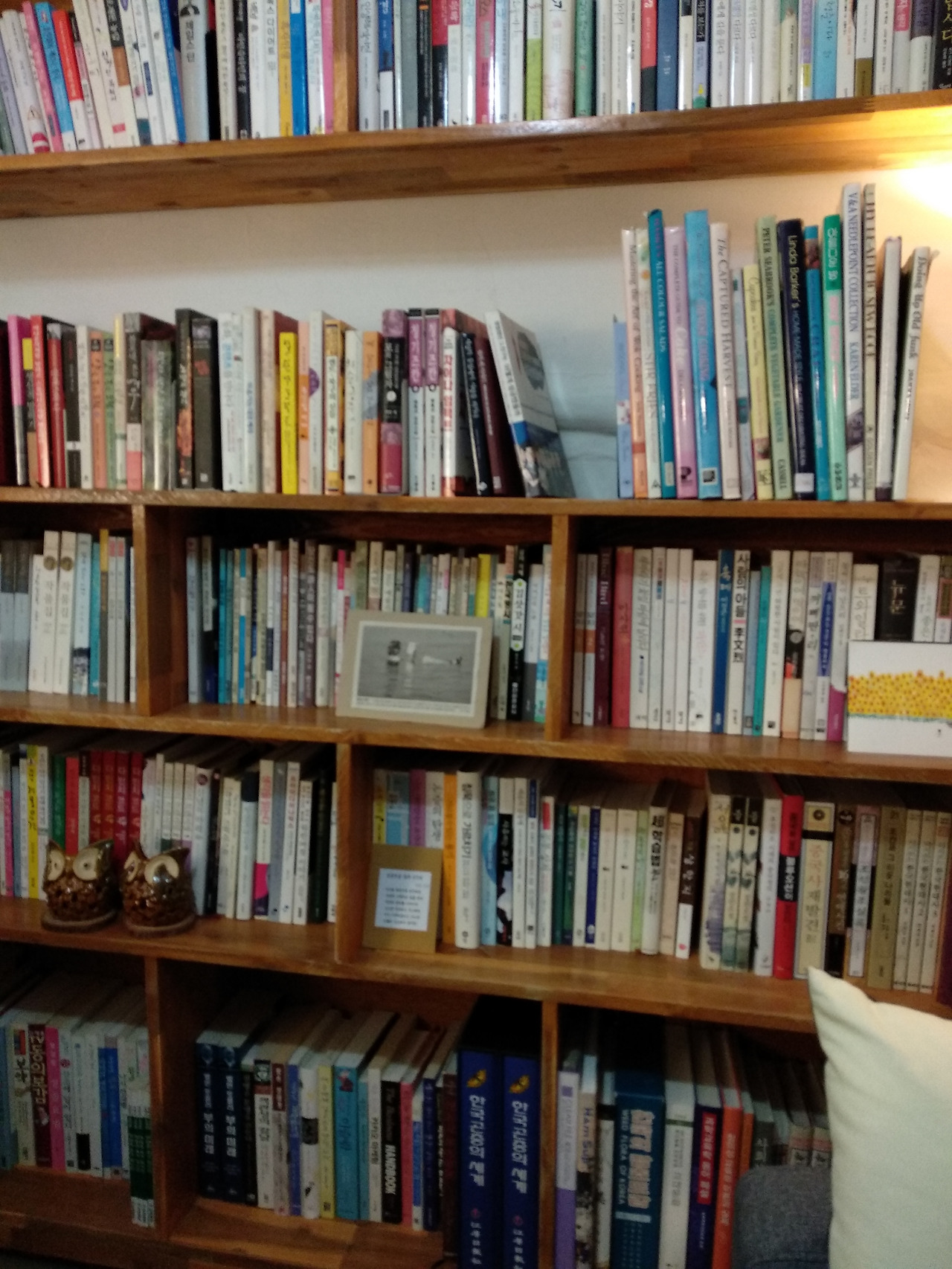이곳은 내가 먼저 메일을 보내서 입고하게 된 곳이다. 우연히 인스타그램을 뒤지다가 알게 되었고 지방 곳곳에 책들이 입점되면 좋을 것 같아 취해본 연락이 입고로 이어졌다. 사진들을 통해서 먼저 본 후에 책방을 가보는 일이 많지만 이곳은 자세히 찾아보지는 않았다. 먼 길을 가서 보게 되는 즐거움과 기대감을 한껏 누려보기 위해서. 벌써 어스름이 밀려오는 마을 속에 자리한 이곳은 안에는 주황빛 등으로 따스하게 반짝였고 어떤 모임인지 모를 몇몇의 사장님과 동년배로 보이시는 분들이 조용하게 대화를 나누며 책을 구경하는 내게 방해가 되지 않도록 배려하고 계셨다.