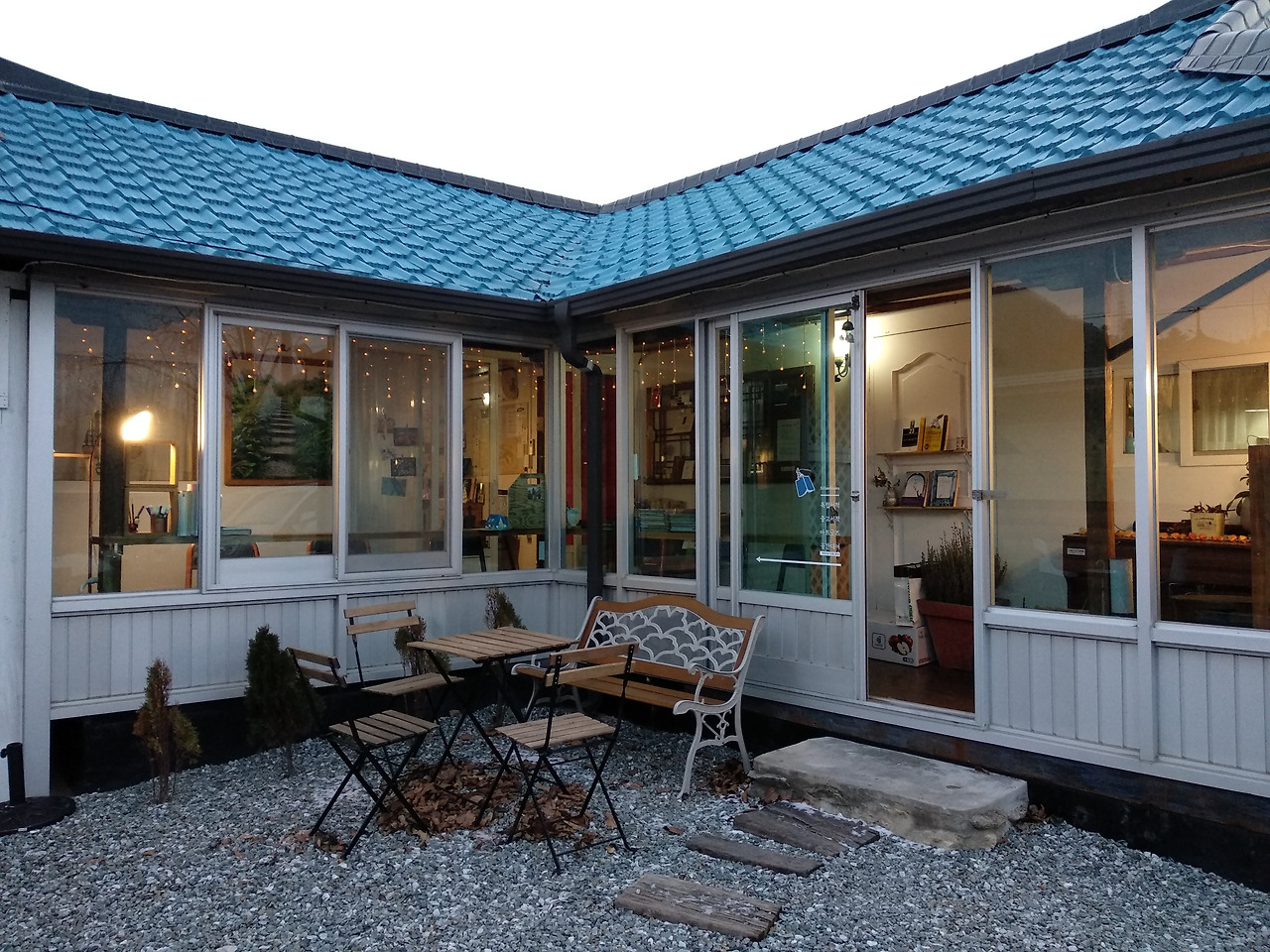 김유정역 맞은편에 있는 작은 마을. 기와지붕들이 보이고 집집마다 굴뚝에 연기가 조용히 흘러나오는 곳. 올망졸망 모여진 집들이 보이자 도착이라는 표시가 떴고 나는 단번에 그곳을 찾을 수 있었다. 파란색 낮은 지붕이 차분한 책방에는 트리가 반짝거리고 조용한 음악이 고요히 흐르고 있었다. 차를 세우고 작은 마당에 깔린 자갈을 자박자박 밟고 옛 시골집 미닫이 문을 드르륵 열고 들어가니 책들이 빼곡히 보였다. 인기척이 들리도록 보이지 않는 사장님은 몇몇의 사람들과 책방 안쪽에 도란도란 앉아계셨고 이 시간에 처음 보는 이가 누굴까 호기심을 띠고 바라보셨다.