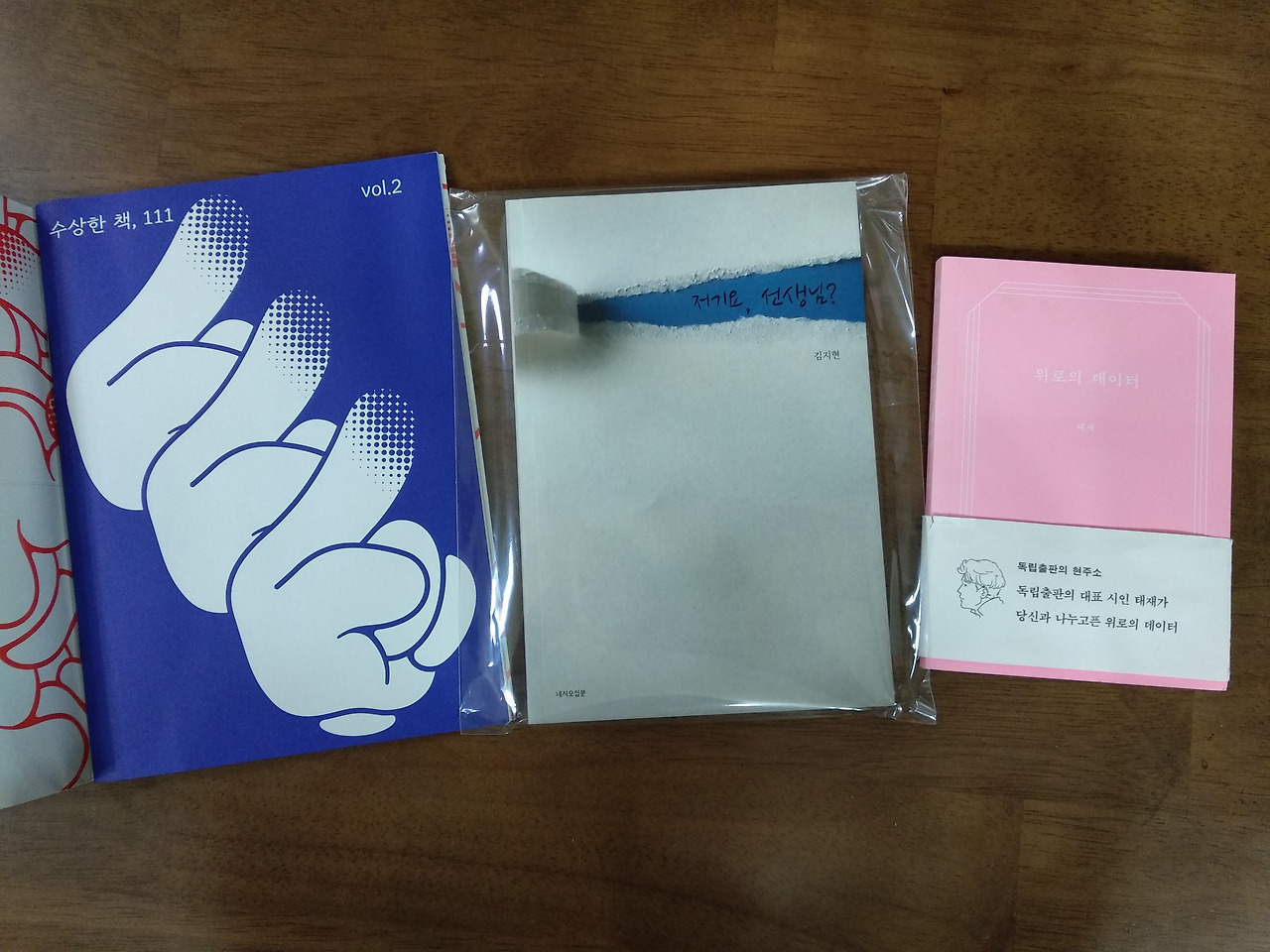 -'수상한 책'(기억 발전소)은 국가폭력 피해자들과 그 유가족들의 인터뷰를 다룬책이다. '저기요, 선생님?'(김지현)은 대안학교에서 글쓰기 수업을 진행하시는 선생님이 쓴 책. 그리고 내가 좋아하는 시집 한 권을 샀다.(위로의 데이터-태재)
