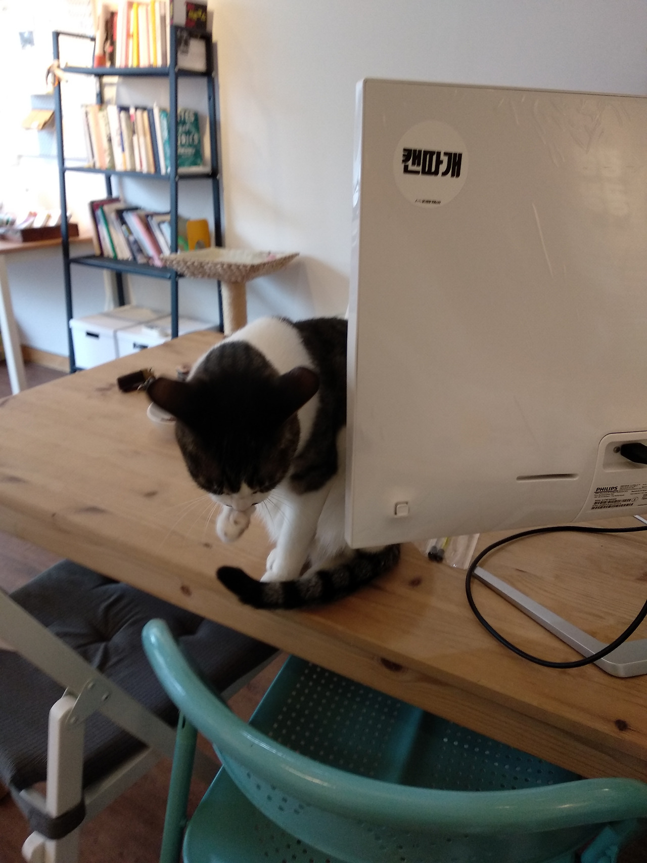 서점 사장님은 젊은 여자분이셨고 남동생과 함께 계셨다. 고양이들이 나가는 걸 막기 위해 설치된 망을 옆으로 밀고 들어서니 책방이 밝고 훤하다. 그야말로 훤하다. 그렇게 느낀 이유는 중간이 뚫려있는 공간 이어 서일 거다. 벽면에 책장들이 위치해있고 캣타워도 있다. 책이 적은 가했는데 구경하다 보니 얇고 작은 책들이 구석구석에서 튀어나왔다. 다른 쪽 벽면에는 판매가 지난 샘플북만 따로 저렴한 가격에 판매하고 계셨다. 나는 또 정신을 놓고 다른 사람들의 피땀 어린 창작물을 싸서 좋다며 집어 들고 있었다.(나도 책을 만들어 보았음에도 구매자 입장에 서면 그런 것들을 금세 잊어버린다) 세일 책을 두권 고르고 세 권의 다른 책들을 골랐다.
