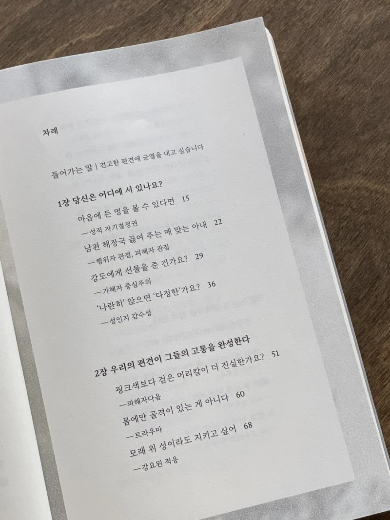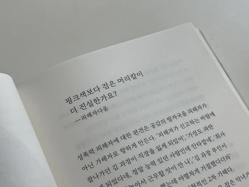 '씻을 수 없는 상처'라는 표현이 떠올랐다. 나는 피해자를 향한 공감 어린 표현이라는 이유로 이 관용적인 말을 두루 사용하곤 했었다. 당시 '상처'에 방점을 두어 '씻을 수 없는'이라는 수식어는 자세히 살펴보지 않았는데, 이제 보니 그것은 주홍 글씨처럼 ‘피해자’라고 낙인을 찍는 것과 같았다. 지나친 공감이 오히려 폭력이 되었다.