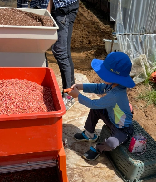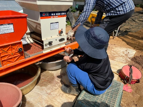 이번 못자리엔 부모님과 형부와 언니, 나와 남편과 두 아이들 그리고 남동생까지 13명이 달라붙었다. 창고에 넣어둔 모판 800여 개와 상토를 트럭으로 옮기고 다시 밭에 도착해 트럭에 실린 모판과 상토를 내렸다. 모판에 상토를 담고, 흙을 고르는 흙칼로 평평하게 다진다. 이 모판을 못자리 기계에 넣은 뒤, 한 사람은 이 기계가 돌아가도록 계속 손잡이를 돌리고 나머지 사람들은 일렬로 서서 모판을 기계에 넣고, 기계에 소독한 볍씨와 흙을 퍼 담는다. 기계에 연결된 호스를 이용해 자동으로 물을 뿌리고 볍씨가 심긴 뒤 다시 그 위에 흙이 뿌려져 기계에서 나오면 서너 명이 달라붙어 모판을 나른다. 물 먹은 흙이 들어있는 모판은 무거워서 이 판을 들어 올려 하우스 안 쪽 끝까지 몇 백 판을 날라 채워 넣으려면 보통 노동이 아니다.