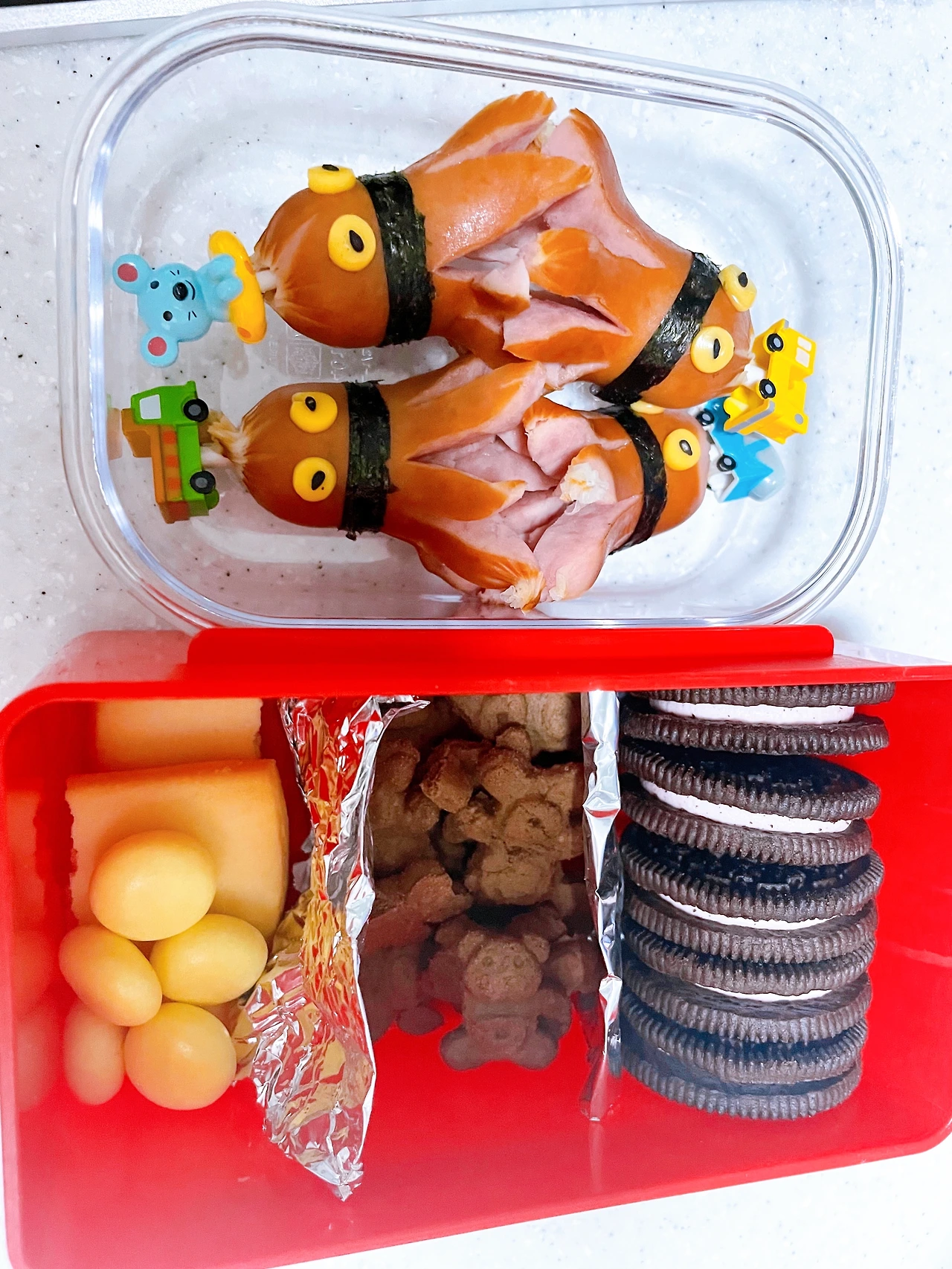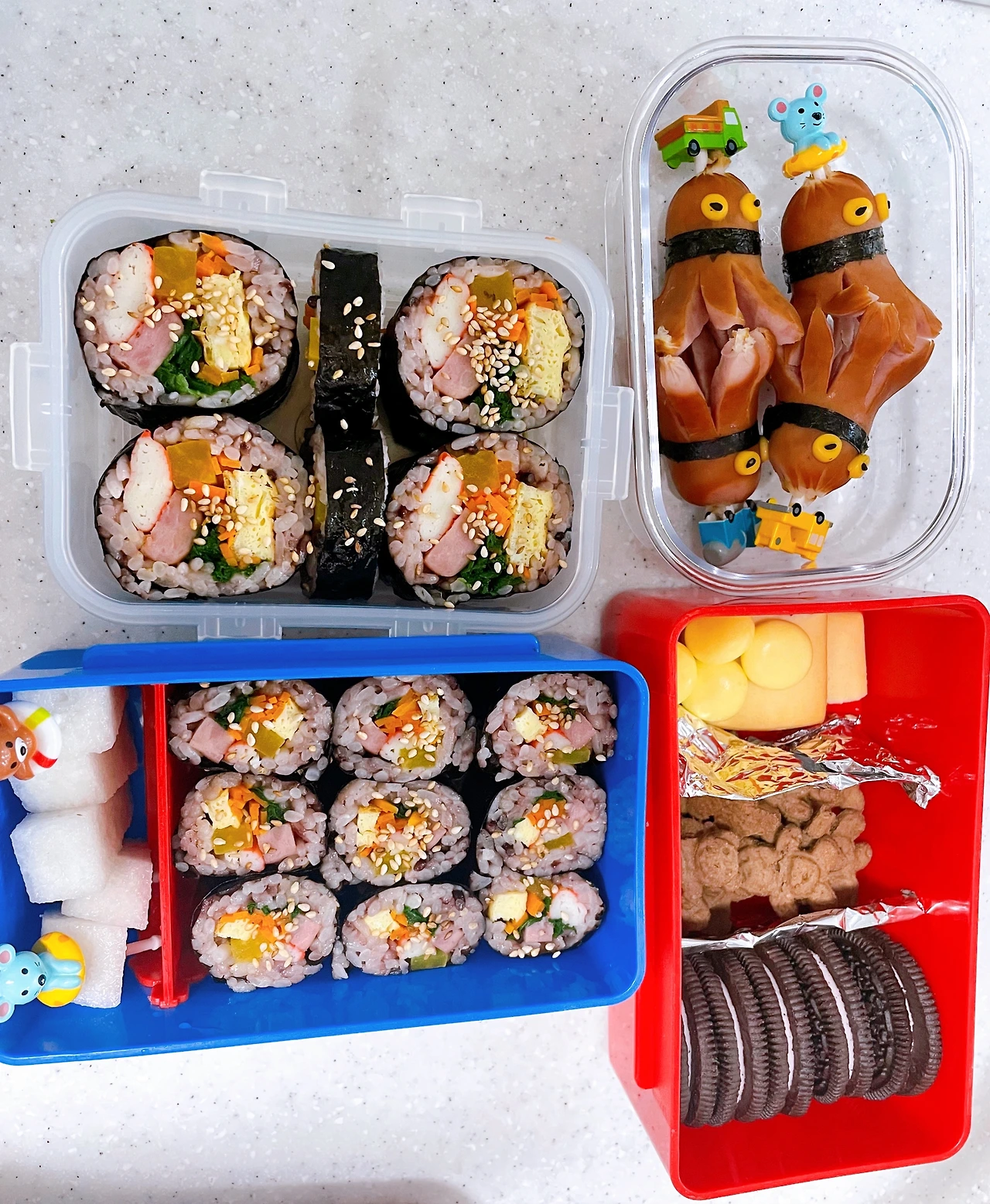 하지만 아직 끝난 게 아니다. 도시락을 꾸며야 한다! 비엔나소시지에 칼집을 내 끓는 물에 데치고 김과 치즈, 검은깨로 문어 4 총사를 만든다. 작고 섬세한 작업이라, 그렇지 않아도 눈이 침침한 새벽에 더 눈이 감겨 온다. 하지만 한 치의 실수도 용납할 수 없다. 실수하는 순간 다시 처음부터 해야 하기 때문이다. 옆에서 "좋겠다, 좋겠다"를 연발하는 첫째를 위한 문어도 준비해야 한다.