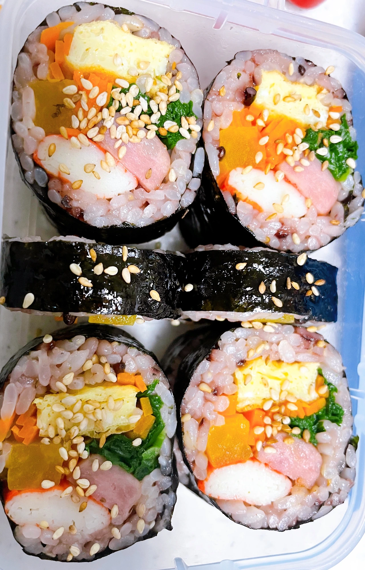 남편과 아이들이 김밥을 좋아해서 종종 싸는데, 둘째가 김밥을 한 입에 넣기 어려워하길래 재료를 반으로 갈라 꼬마 김밥을 싸줬더니 그걸 말하는 것 같았다.