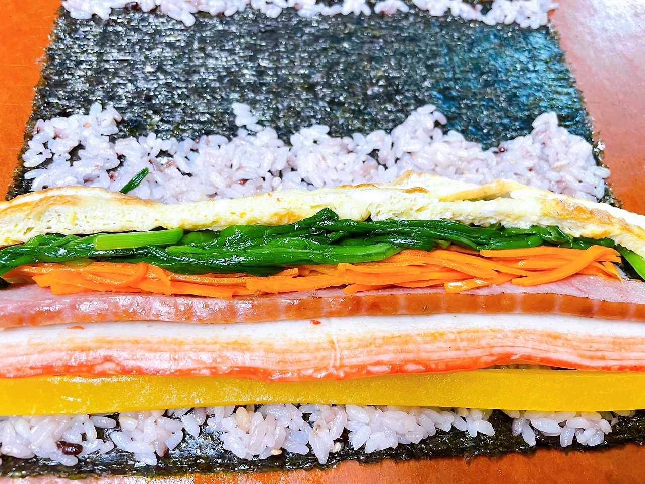 밥솥에 김이 모락모락 피어오르면 밥을 양푼에 담아 한 김 식히고, 소금과 깨, 참기름을 넣어 살짝 간을 입힌다. 구운 김을 바닥에 깔고 그 위에 밥을 반만 최대한 얇게 펴 바른 뒤 단무지, 게맛살, 햄, 당근과 부추, 달걀지단 순으로 넣고 손으로 꾹꾹 눌러가며 돌돌 만다.