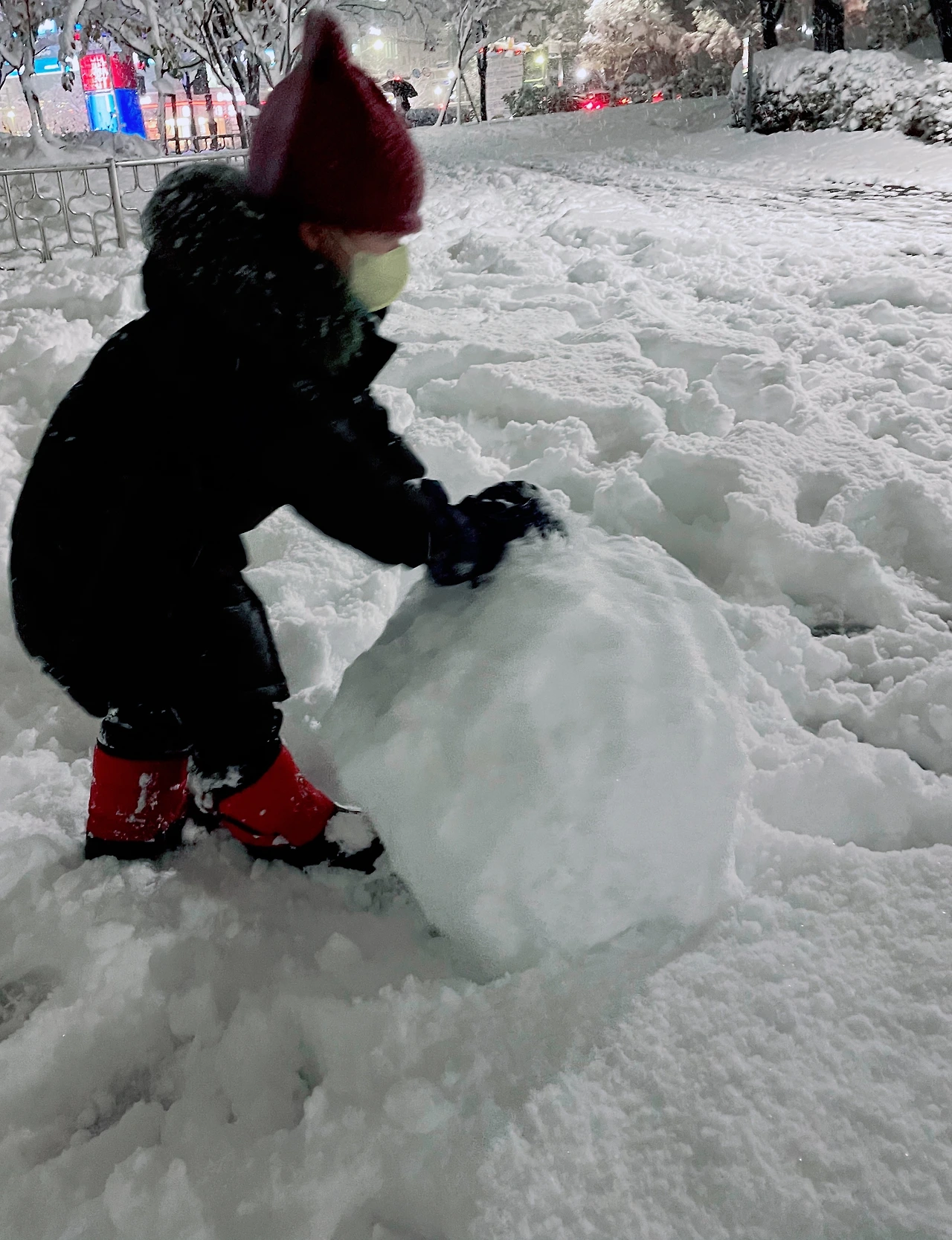 따뜻하게 입고 나오라고 그렇게 신신당부를 했건만, 집에 있던 그대로 맨발에 부츠만 신고 나왔다. 털모자도 안 쓰고, 잠바 지퍼도 안 잠근채 땀을 뻘뻘 흘리며 눈덩이를 굴린다.