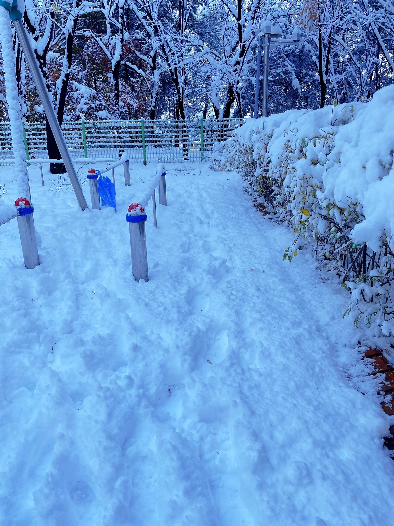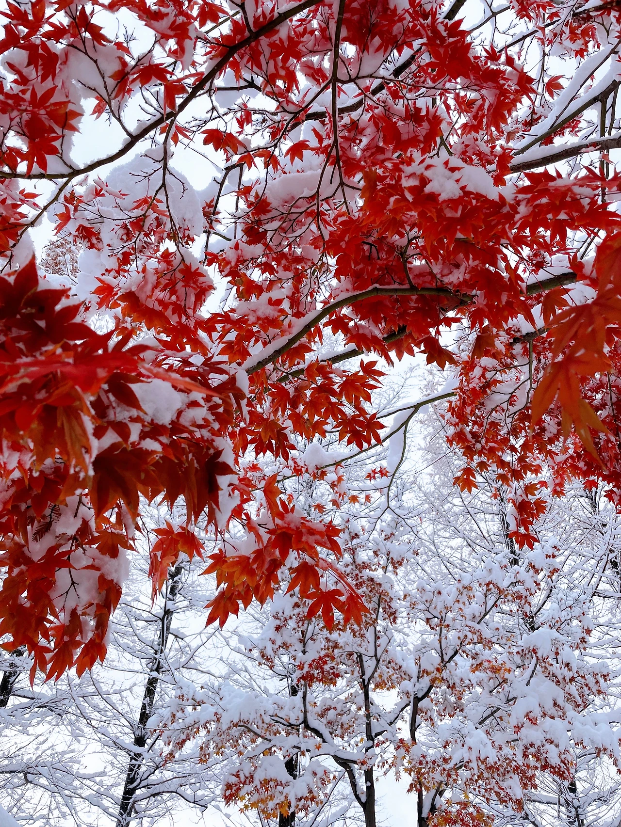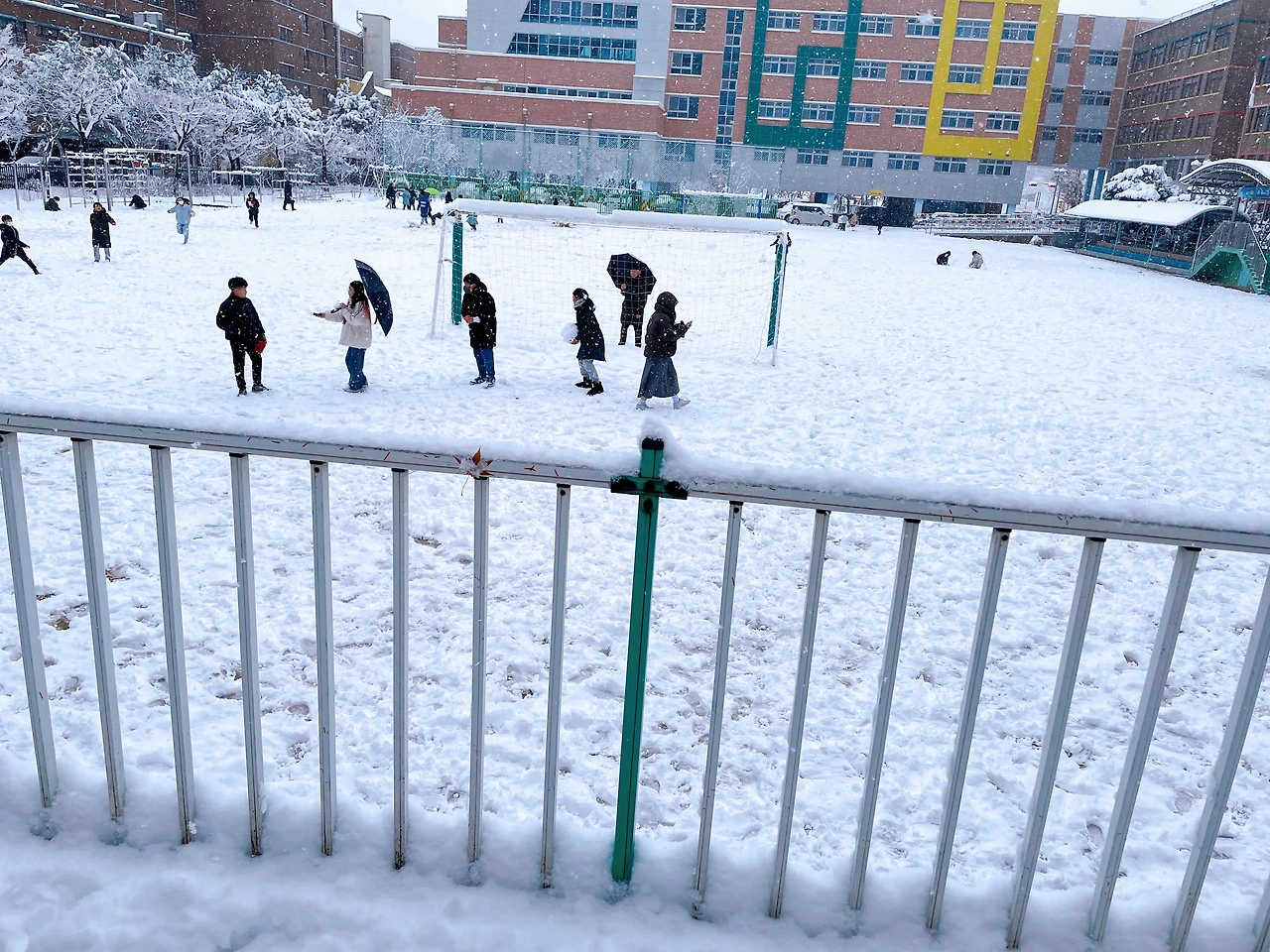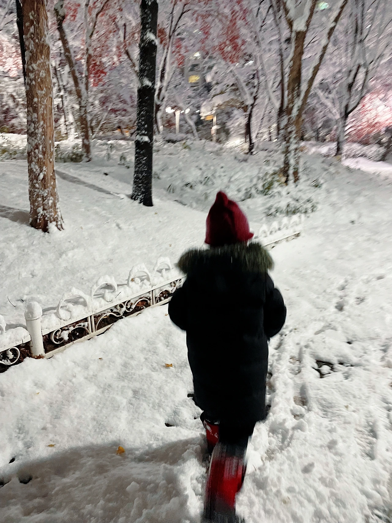 우산을 들고 첫째 마중을 나갔다. 눈발 위에 떨어진 단풍잎의 색깔이 하얀색과 대조되어 더욱 곱게 빛을 발했다. 앞사람이 지나간 길을 뒤 따라 걸어도 금세 눈에 덮여 흰 눈을 밟고 걷게 되었다. 학교 앞에 이미 많은 학부모들이 우산을 들고 서 있었다. 나무 아래 있으면 눈이 갑자기 풀썩 쏟아지기도 했다. 신난 아이들이 강아지처럼 운동장을 뛰어다녔다. 눈덩이를 굴리고, 눈뭉치를 만들어 던지고, 여기저기서 고주파 비명소리가 행복하게 떠다녔다.