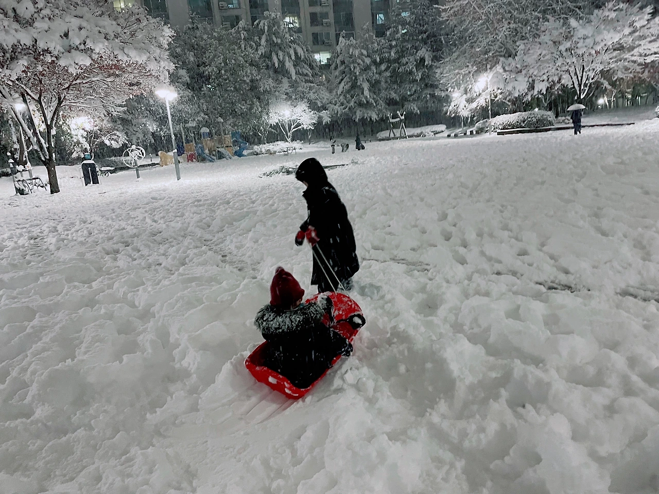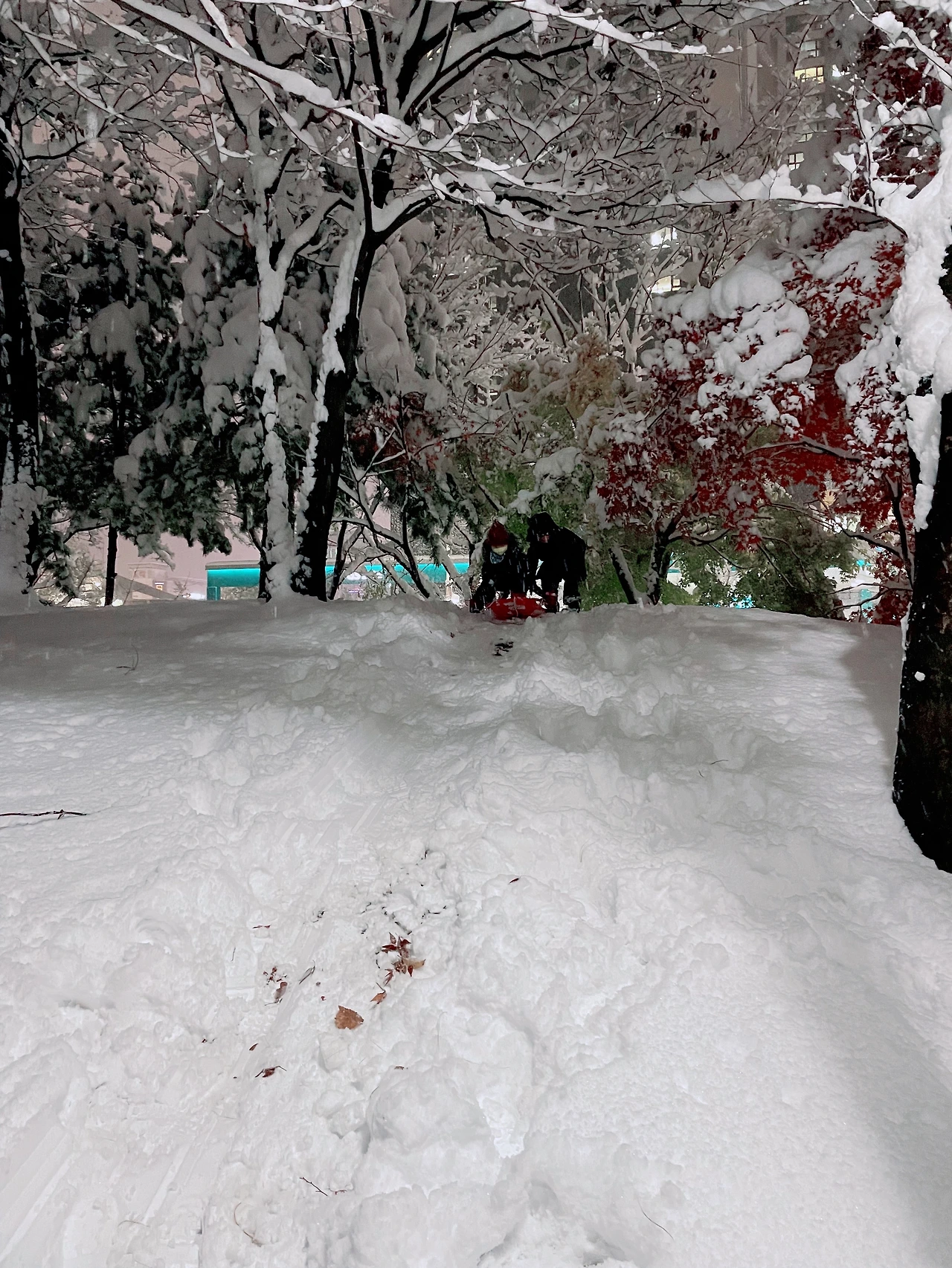 집에서 숙제를 마친 첫째에게 연락이 왔다. 첫째는 핸드폰이 없기 때문에 집에 있을 땐 아이패드의 영상통화 기능으로 나와 통화를 한다. 집 앞 공원에 도착했단 말에 첫째가 썰매를 챙겨 쏜살같이 튀어나왔다. 이미 낮에 친구들과 한바탕 놀고도 아직 여한이 많은 첫째.