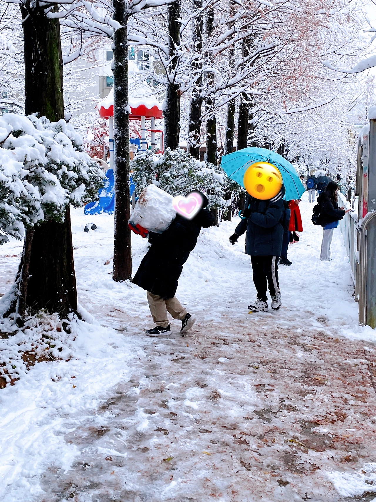 오후 3시. 걸어서 둘째를 데리러 갔다. 둘째도 눈놀이를 하게 해주고 싶어 태권도 수업을 취소하고 핫팩을 챙겨 나왔다. 눈이 잠깐 그치다 다시 쏟아지길 반복했다.