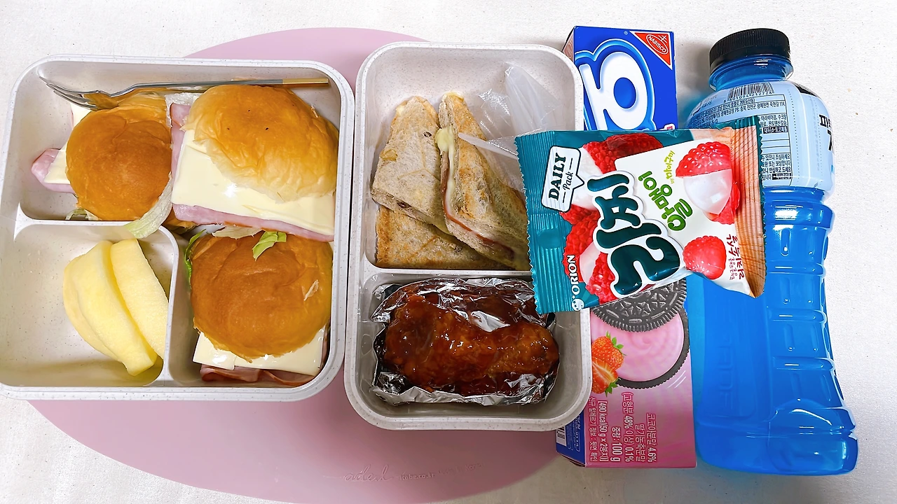 부드러운 모닝빵을 반으로 갈라 딸기잼을 바르고 양상추와 햄, 치즈를 넣는다. 호두가 들어간 잡곡 식빵은 거친 테두리를 자르고 속살에 잼과 햄, 치즈를 넣고 파니니 틀에 굽는다. 전에 쓰던 도시락 통이 작아져서 막둥이 주고 새로 산 도시락 통을 꺼냈다. 사과를 먹기 좋게 자르고 양념치킨 다리도 하나 넣는다. 간식으로 사둔 과자와 젤리, 이온 음료와 물도 담고 작은 돗자리도 챙겨준다. 소란스러운 소리에 깬 막둥이가 식탁 의자에 앉아 입을 삐죽 내민다.