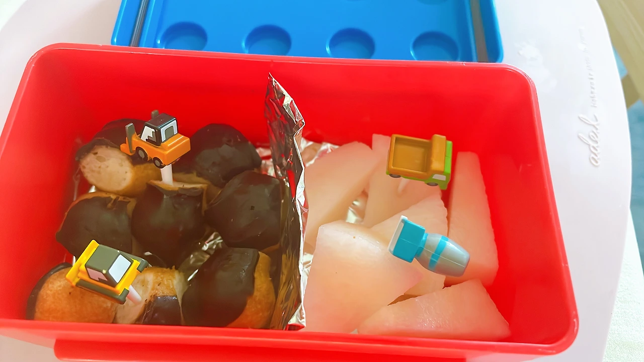 "나도 도시락통 새거 사줘. 나도 과자랑 젤리 줘. 나도 형아처럼 소풍 가고 싶어. 지금 바로. 오늘 갈래."
