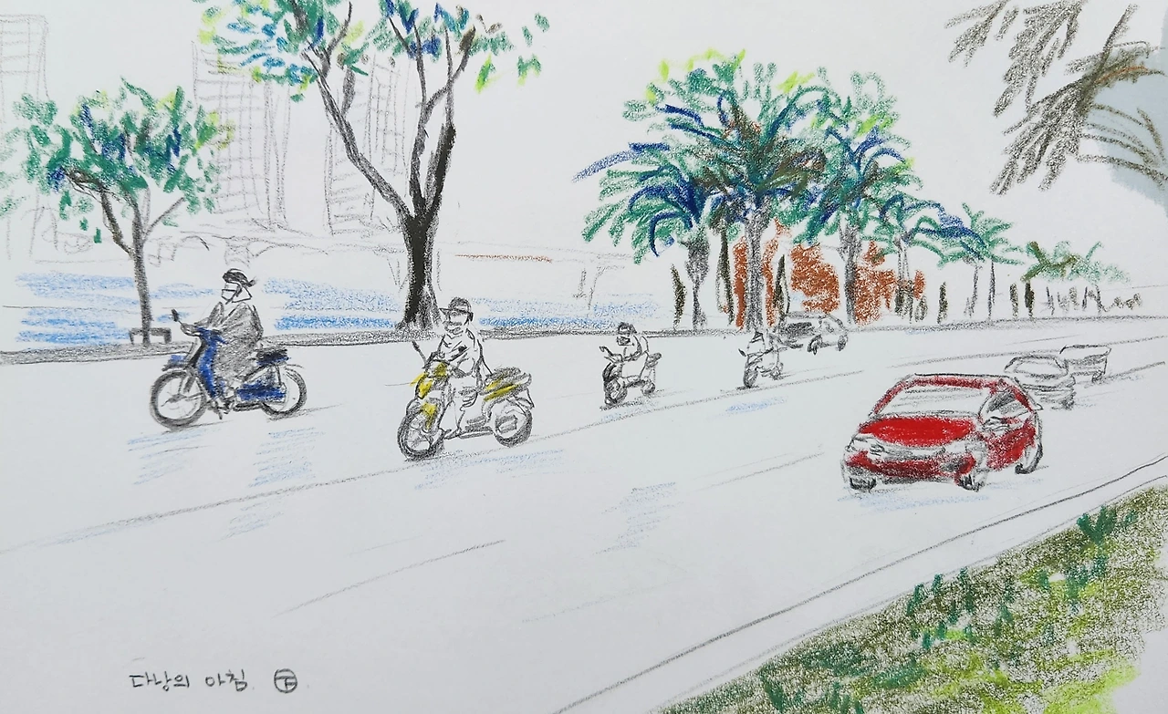 7시도 안 되어 조식을 먹고 일찍 내려가 엄마와 거리 풍경을 보았다. 아침 출근하는 오토바이와 자동차들이 쉴 새 없이 지나갔다. 도로를 보고 또 여행 중 관광버스를 타면서 느낀 거지만 이곳에서의 오토바이와 자동차는 우리처럼 과속하지 않는다. 어쩌면 수많은 오토바이와 도로를 공유해야 하는 베트남이기 때문에 과속이 큰 사고로 이어질 가능성이 높아 서로 과속을 하지 않는 불문율 같은 규칙이 생긴 건 아닌가 생각이 들었다. 비 오는 거리를 펄럭이는 비닐우비 입고 달리는 라이더들은 모두 헬멧을 꼭 착용하고 있었다.