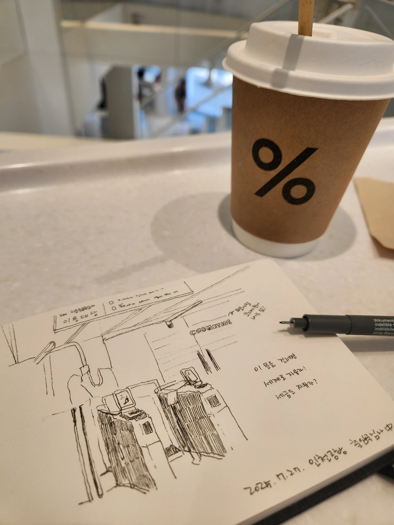 커피를 마시면서 이번 여행의 로망이었던 첫 드로잉을 했다. 출발하면서 찍어두었던 사진들을 보면서 천천히 선을 그었다. 거의 1년 반만의 드로잉이었다. 오랜만에 스케치 없이 펜으로 하니 선도 지저분하고 전체적인 균형도 엉망이다. 그래도 시작이 중요하니까. 그렇게 간단한 5개의 선 드로잉을 완성했다.