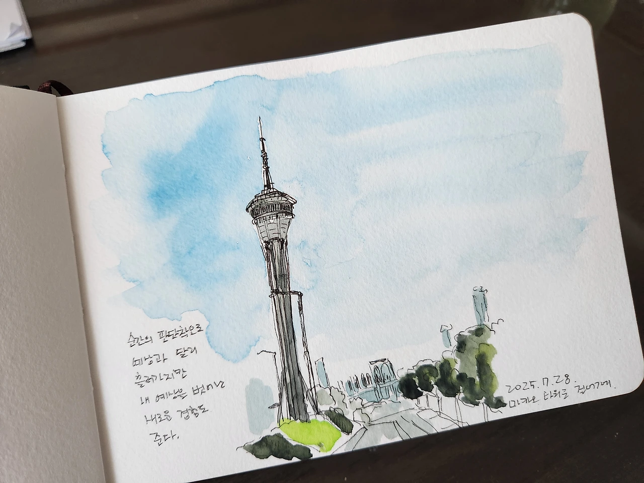 걸어가는 게 옳은 방법이었나 싶을 정도로 덥고 습했다. 그래도 점점 가까워지는 타워를 등대 삼아 걸어 드디어 도착. 도심이 한눈에 보이는 57층의 실내 전망대로 올라갔다. 내가 묵는 호텔이 있는 마카오 반도와 화려한 카지노 호텔이 있는 섬이 보였다. 그 사이를 잇는 긴 다리에는 가로등이 켜지기 시작했다. 점점 날이 흐려져 시야가 흐릿해졌다. 좀 더 맑은 날씨였으면 좋았을 텐데 조금 아쉬웠다. 시원한 실내에 앉아 여유 있게 그림을 그렸다.