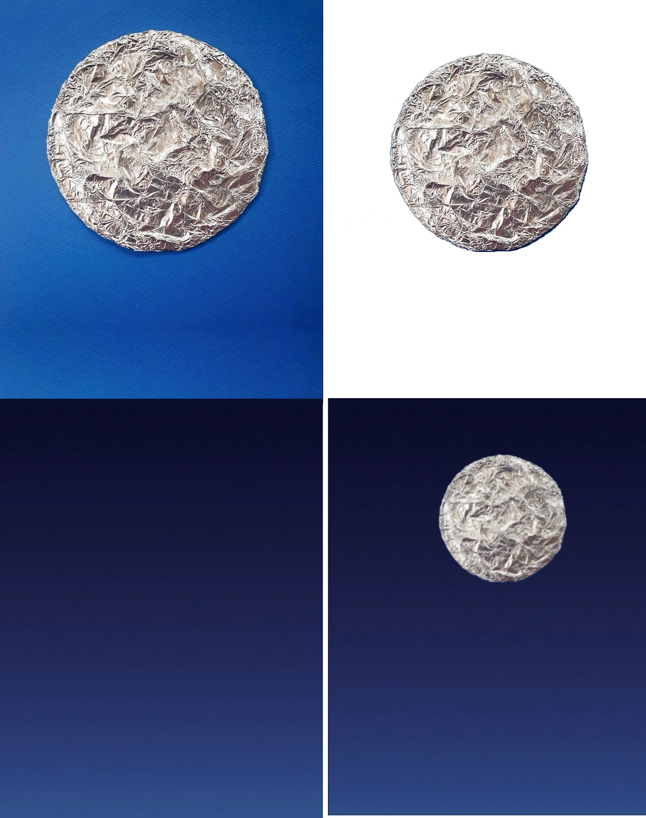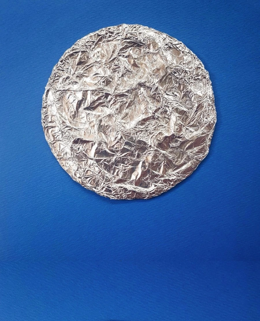 5년 전 아이들과 미술 수업을 하면서 만들었던 작품이에요. 채색으로 이루어진 그림이라기보다 꼴라쥬에 가까워요. 불규칙적인 무늬가 있는 달을 표현하기 위해 먼저 알루미늄 호일을 구깁니다. 구겨진 무늬를 잘 살려서 펴면 그럴듯한 달 모양이 나와요. 그대로 원형의 종이에 감싸 붙여 달을 완성합니다.
