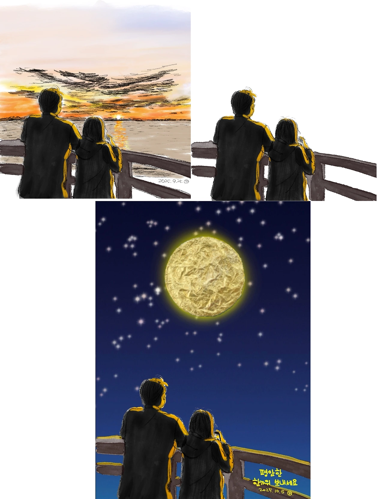 자, 이제 지난번 제부도 풍경을 그린 우리 부부의 모습을 넣으려고 해요. 마찬가지로 원본 그림에서 부부의 모습만 남기고 투명화시킵니다. 그리고 위에서 만든 달배경이미지에 부부의 PNG파일을 올려요. 마침 석양의 노란빛이 실루엣에 비치는 게 달빛과도 잘 어울리네요.