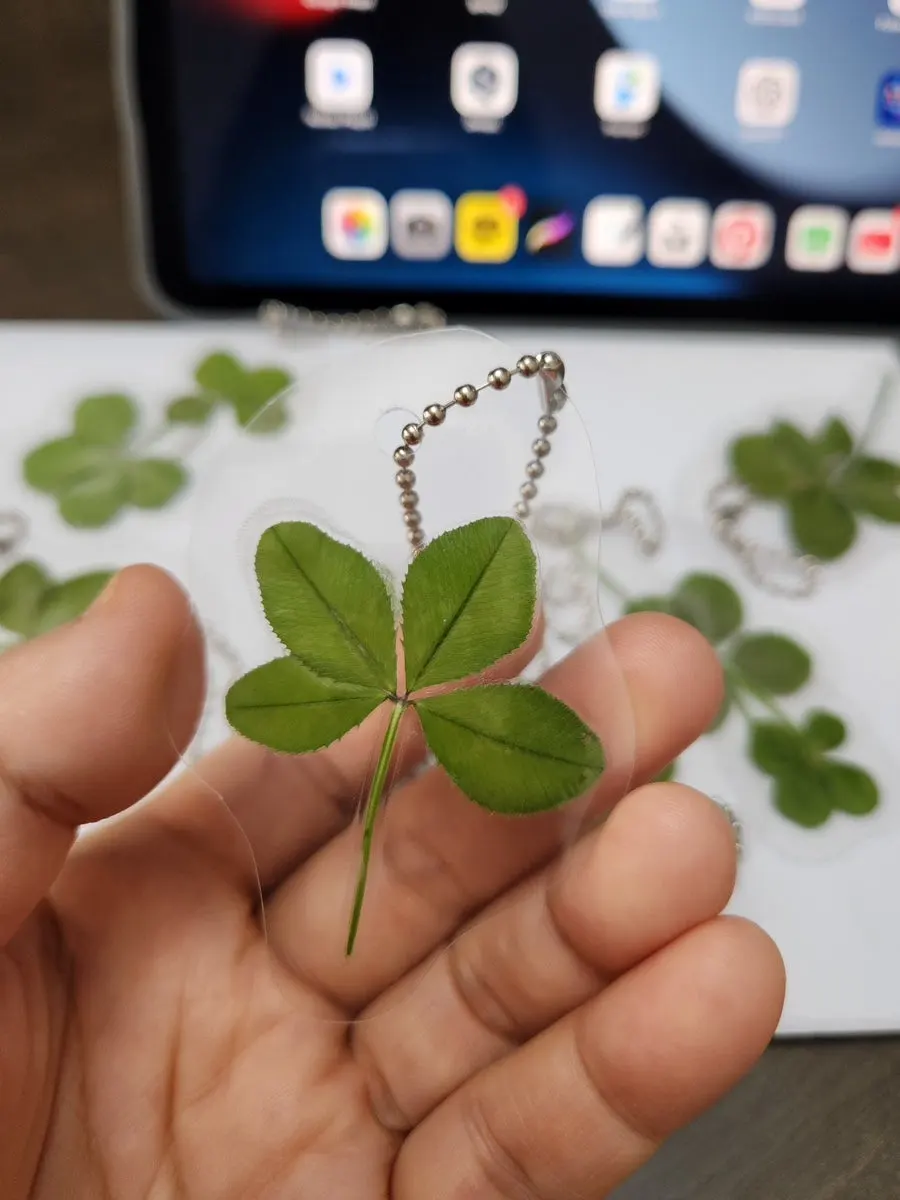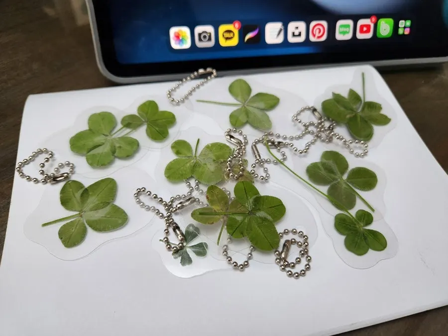 그 주말, 종일 산책하면서 총 25개의 네잎클로버를 찾았고 책갈피에 잘 말려두었다. 잘 마른 네잎클로버를 코팅해서 구멍을 뚫어 열쇠고리로 만들었다. 아이들 몰래 준비하느라 잘 숨겨두었다.