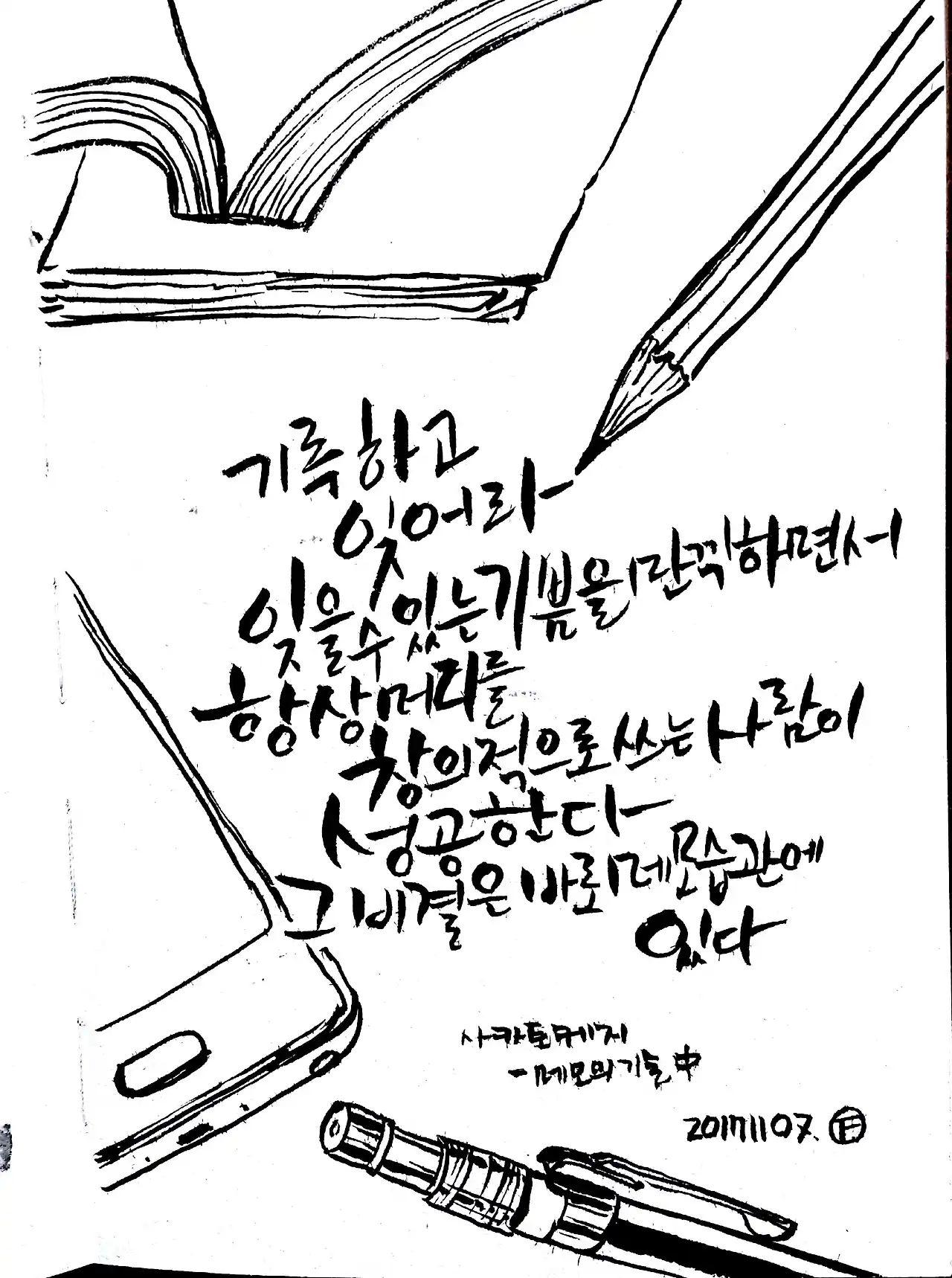 잊어도 된다니. 다 기억할 필요가 없다니. 기억은 메모에게 맡기고 잊으라니. 갑자기 머릿속이 시원해졌다. 나는 그 문장으로 붓펜으로 옮기고, 작은 그림과 함께 오래 들여다보았다.