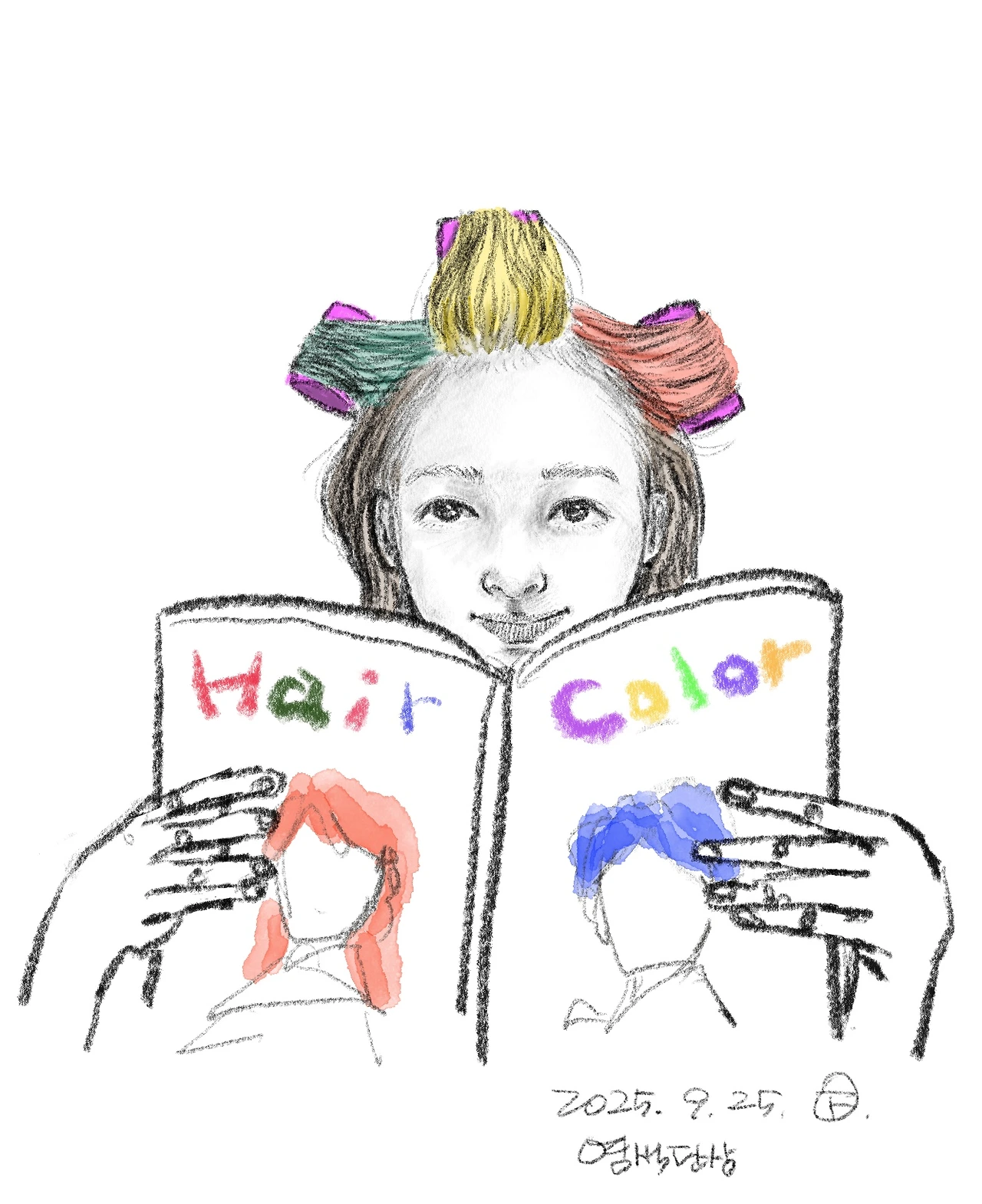 나는 이제 패션 염색이 아닌, 흰머리를 가리는 염색을 정기적으로 해야 하는 나이가 되었다. 사실 이미 머리칼의 절반이 흰머리다. 알면서도 자꾸 덮는다. 보름만 지나도 희끗한 머리뿌리가 존재감을 드러낸다. 그 시간이 어찌나 빨리 다가오는지. 볼 때마다 너무 신경이 많이 쓰여 참지 못하고 바로 미용실을 찾는다. 나는 흰머리를 덮지만, 어쩌면 보이지 않게 덮고 싶은 건 시간인지도 모른다.