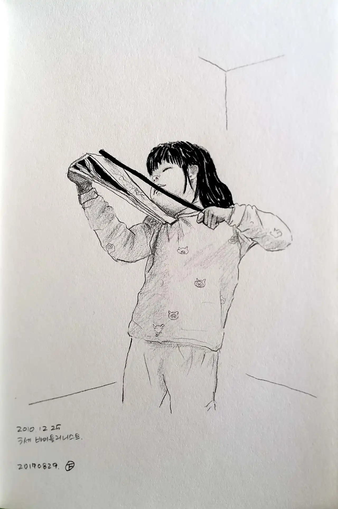 어느 크리스마스 전날 밤, 온 가족은 거실에서 함께 시간을 보내고 있었다. 남편이 좋아하는 클래식 cd를 샀다면서 오랜만에 바이올린 협주곡을 들려주었다. 소파에 앉아 놀던 막내가 가만히 귀를 쫑긋 세우더니 총총걸음으로 방으로 들어갔다. 잠시 후 가지고 나온 사진 앨범과 리코더 청소막대.