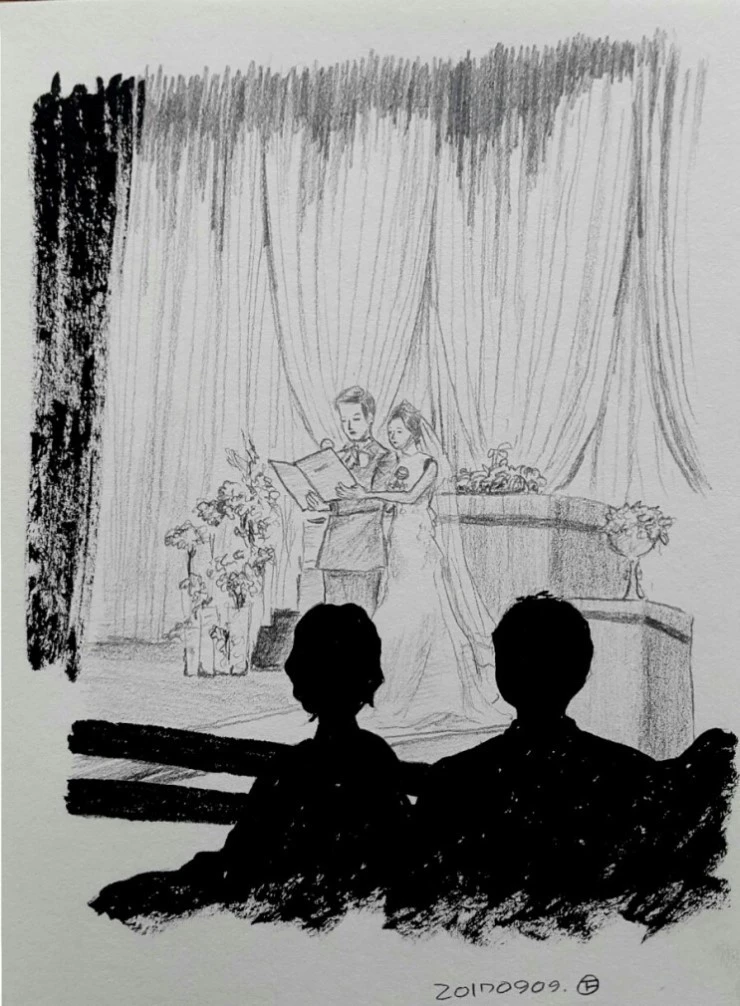 그 빛의 가장자리에는 부모님이 계셨다. 세상의 모든 빛이 신랑신부를 향해 쏟아지는 탓에, 부모님의 뒷모습은 유난히 짙고 어둡게 보였다. 어머니는 가끔 눈가를 훔쳤고, 아버지는 그런 어머니의 손등을 조심스레 토닥였다. 예전에 미처 보지 못했던 장면이었다. 그 모습이 문득, 어느 해 내 부모의 모습과 겹쳐보았다.