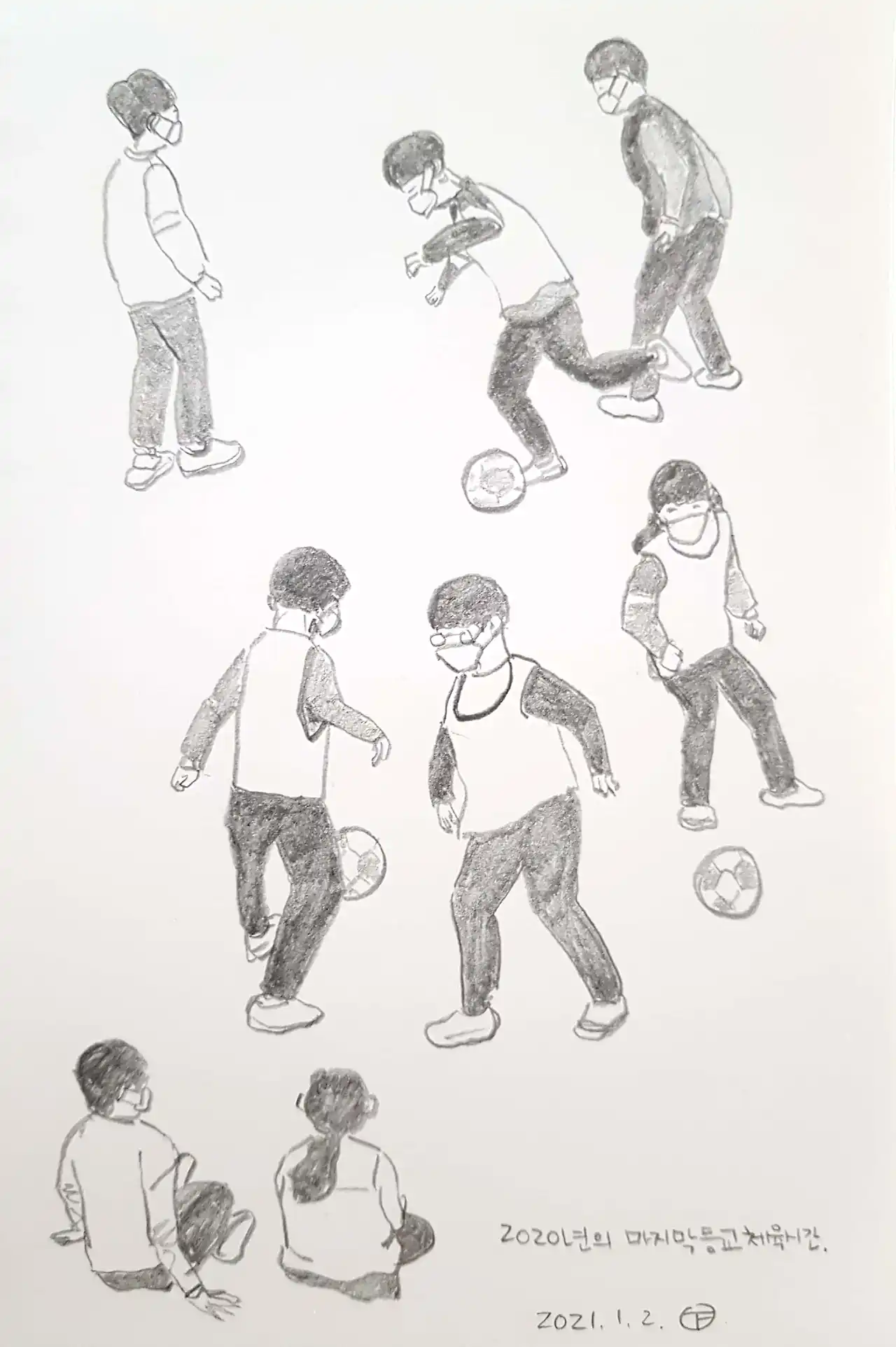 겨울방학을 앞둔 체육시간, 처음으로 공놀이를 했다. 함께 하는 경기임에도 각자 자기 공을 가지고 활동을 하고 수업이 끝날 때 소독액이 들어있는 분무기로 공을 닦았다. 그래도 오랜만의 신체활동이이서 아이들은 좋아했다. 그 모습이 참 애처로웠다. 언제까지 이래야 할까.