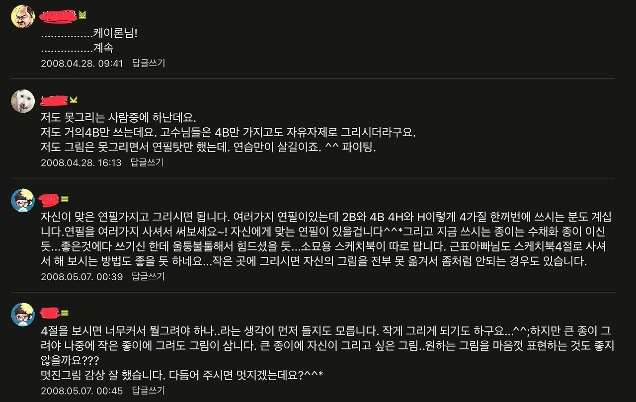 아무런 피드백도 없이 그리다가 답답했던 나는 다른 회원분들에 비교하면 쑥스러운 그림을 올리고 조언을 부탁드렸다. 그러자 주르륵 달리는 댓글.