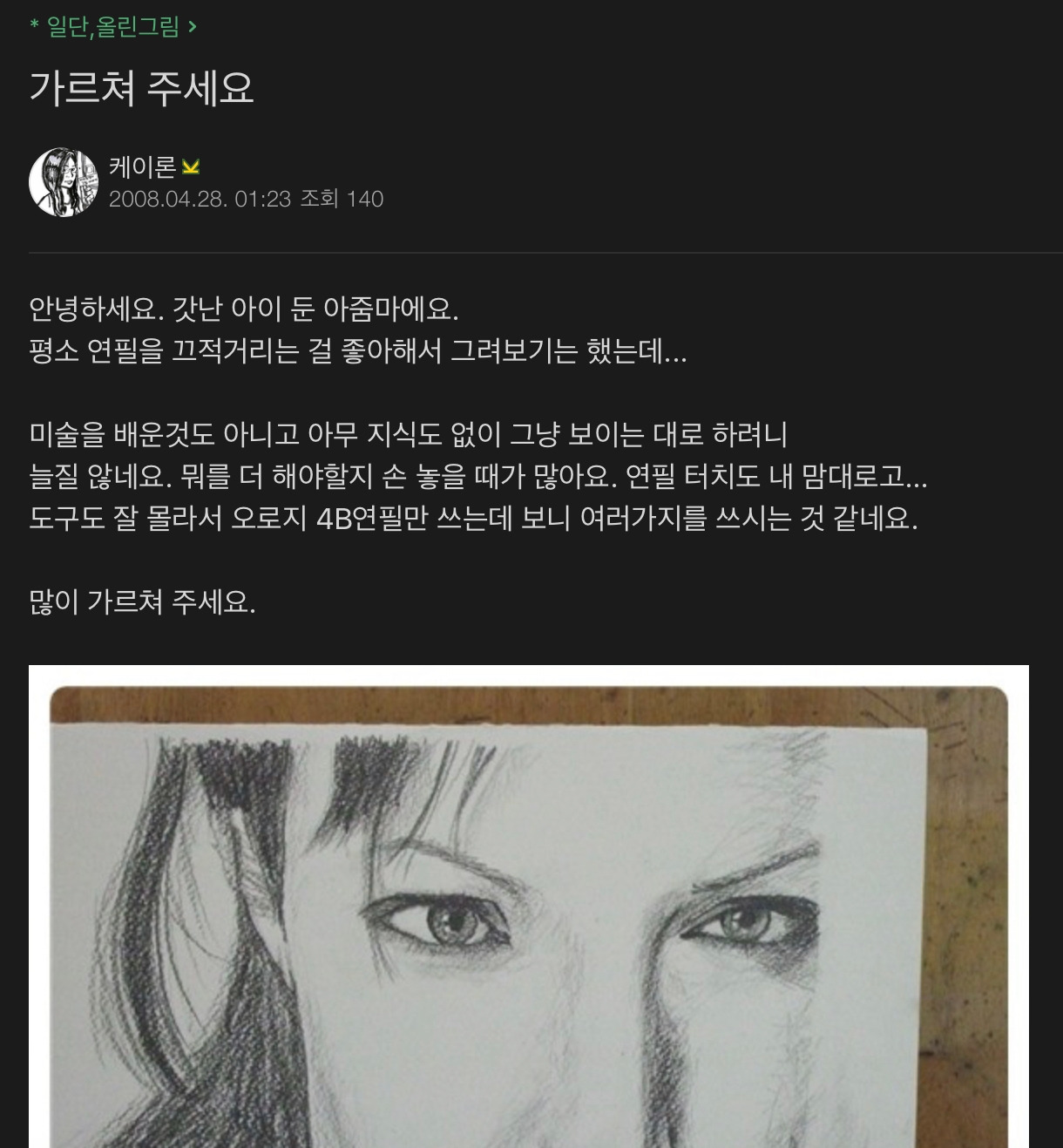 입이 떡 벌어졌다. 좀 더 잘 그리고 싶다는 열망으로 찾기 시작한 인터넷 서핑에서 연필화를 그리는 사람들이 모여있는 온라인 까페. 가입승인이 되자마자 그림들을 훑기 시작했다. 그리고 모니터 앞에 펼쳐진 엄청난 그림들!