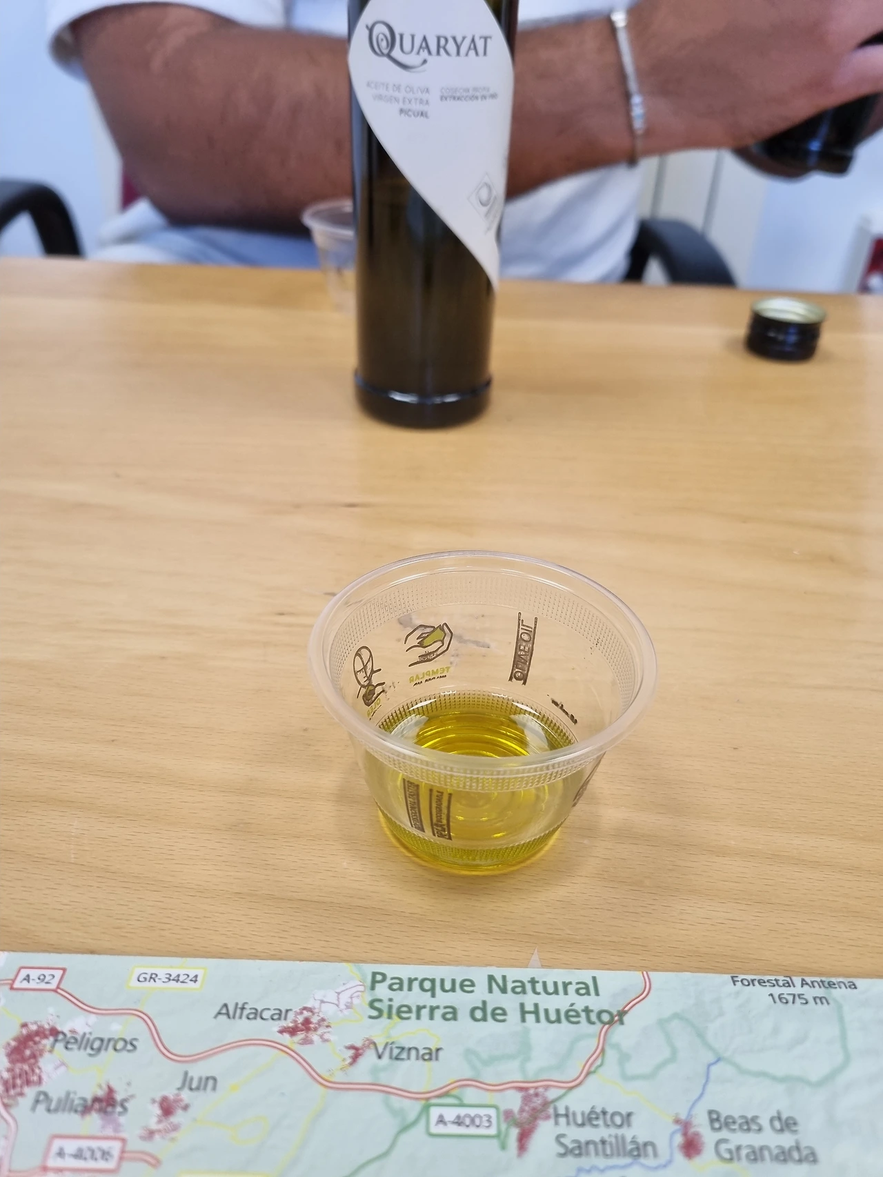 빵과 함께 진행될 거라는 생각과 달리 우리는 오일 1/4잔을 온전히 마셔보는 방식으로 시음을 했다. 잔을 손으로 막고 돌려 온도를 높이고 올리브오일 자체의 맛과 향을 음미하는 방식. 올리브오일은 3가지로 그 맛을 구분하는데 과일맛(fruity), 매운맛(Spicy), 한 가지 더(잊어버림!)이 그것이다. 품종별로도 맛이 달라 처음 시음한 Arbequina 품종은 부드러운 과일향이 나다가 목에서 넘길 때쯤 칼칼한 매콤함이 느껴졌고 Picual의 경우 좀 더 매운맛이었다. 익숙치 않은 방식에 아빠는 표정이 일그러졌고 엄마랑 나도 조금 당황했지만 진짜를 경험에 본 것 같은 기분이 들었다.