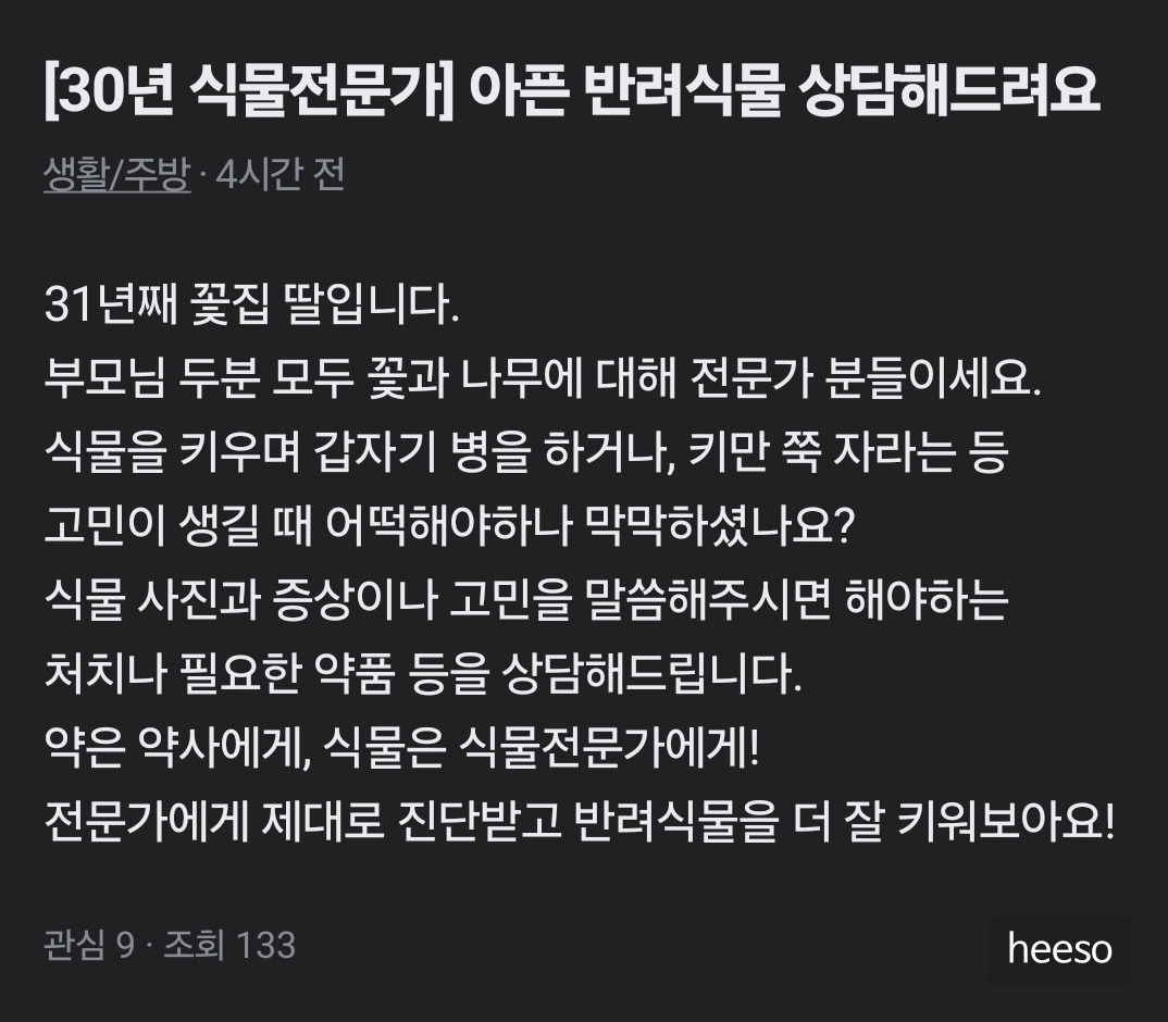 글을 올린 지 4시간이 지난 현재 기준, 9명이 관심을 눌렀다. 아직 채팅 요청은 없지만 꽤 고무적이라 느껴졌다. 정말 지인의 말처럼 이런 니즈를 가진 사람들이 꽤 있는 것일지도 모른다. 잠깐동안 상담 채팅을 하고 필요한 약 등의 물품을 포장하는 모습을 상상했다. 얼마 전 엄마는 배민을 통해 첫 꽃바구니 주문을 받았다고 했다. 거대한 플랫폼에 종속돼서 일을 하게 되는 것 같아 씁쓸하단 말을 했지만 난 우리 가게가 시대의 큰 파도에 올라탄 것 같아 귀한 발걸음이라 느껴졌다. 만일 이 상담이 사업화가 가능하다면 반려식물이라는 개념이 나오면서 새롭게 열리는 사업기회가 될 수도 있지 않을까? 지켜봐야겠지만 가설이 아주 터무니없는 것은 아니라는 것을 알게 됐다.