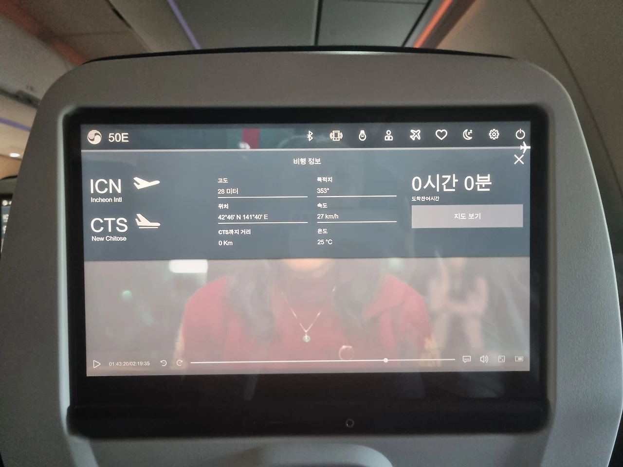 이번 홋카이도행 비행경험은 꽤 놀라웠다. A321-200 기종이었는데 크진 않지만 3-3 배치에 넓은 좌석 간 거리와 깔끔한 기내환경이 쾌적한 비행환경을 제공했다. 아마 최근에 매입한 기체이거나 혹은 리모델링을 진행한 것 같았다. 좌석 앞 화면이 기존에 탔던 어떤 비행기보다 크고 선명했고 최신의 운영체제를 갖추고 있었기 때문이다. 베젤은 얇고 화면이 커져서 체감상 의자와 화면사이의 거리가 좀 더 떨어졌으면 좋겠다는 생각을 들게 했다. 최신영화나 음악 등 즐길거리도 많았고 다양한 언어선택 옵션이 가능했다. 더빙은 영어, 프랑스어, 독일어, 스페인어, 자막은 한중일에 영어까지 가능했다. 가장 놀란 건 기내 모니터에 개인 무선 이어폰을 블루투스로 연결해 사용이 가능하다는 점이다. 지난 스페인 여행에서 탑승했던 에어차이나의 경우 갈 때는 구식 모니터가 있었지만 한국어 자막은커녕 영어 자막도 제대로 제공되지 않았었고 올 때는 그마저도 아예 없었다. 비행기에서 즐길 수 있는 서비스가 이렇게까지 발전하다니! 마치 비행기를 처음 타본 사람처럼 엄마를 붙잡고 호들갑을 떨었다.