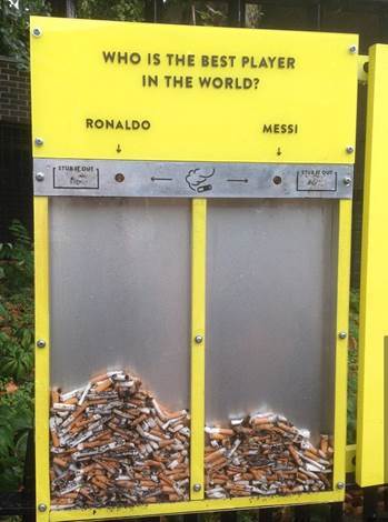 어느 버스정류장 앞에 아래와 같은 담배수거 통이 부착되었습니다. 담배를 피고 버리는 사람들 때문인데요. 꽁초를 쓰레기통에 버리면 좋겠지만, 그런 행동을 유도하는 건 쉽지 않은 일이죠. 그래서 담배꽁초를 버리는 행위를 조금 더 센스 있게 유도했습니다. 세계적인 축구선수 메시와 호날두 중 누가 더 베스트 플레이어인지 팬덤경쟁을 시키면서 담배꽁초를 많이 받은 선수를 응원하게끔 유도한 것입니다. 있던 꽁초 뿐만 아니라 바닥에 떨어진 꽁초까지 주워 담았다는 후문입니다. 요즘 한국에서 했다면 결과는 어땠을지 궁금하네요